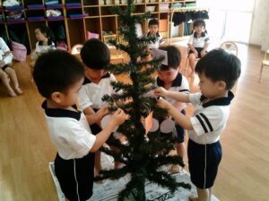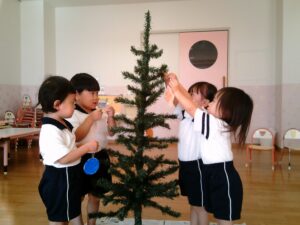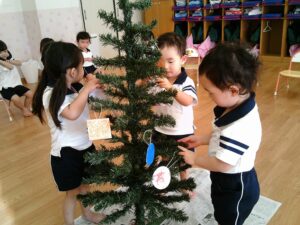 以前に色をぬって製作した丸、三角、四角のオーナメントをクリスマスツリーに飾り付けをしました。「ここにする!」「上につける!」と好きなところに飾りつけをしていた子ども達。完成したクリスマスツリーを見て、「かわいい!」ととても喜んでいました。