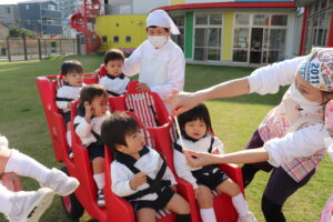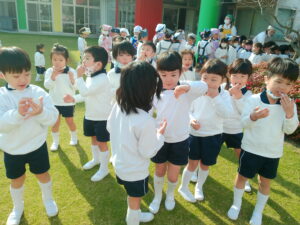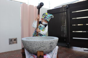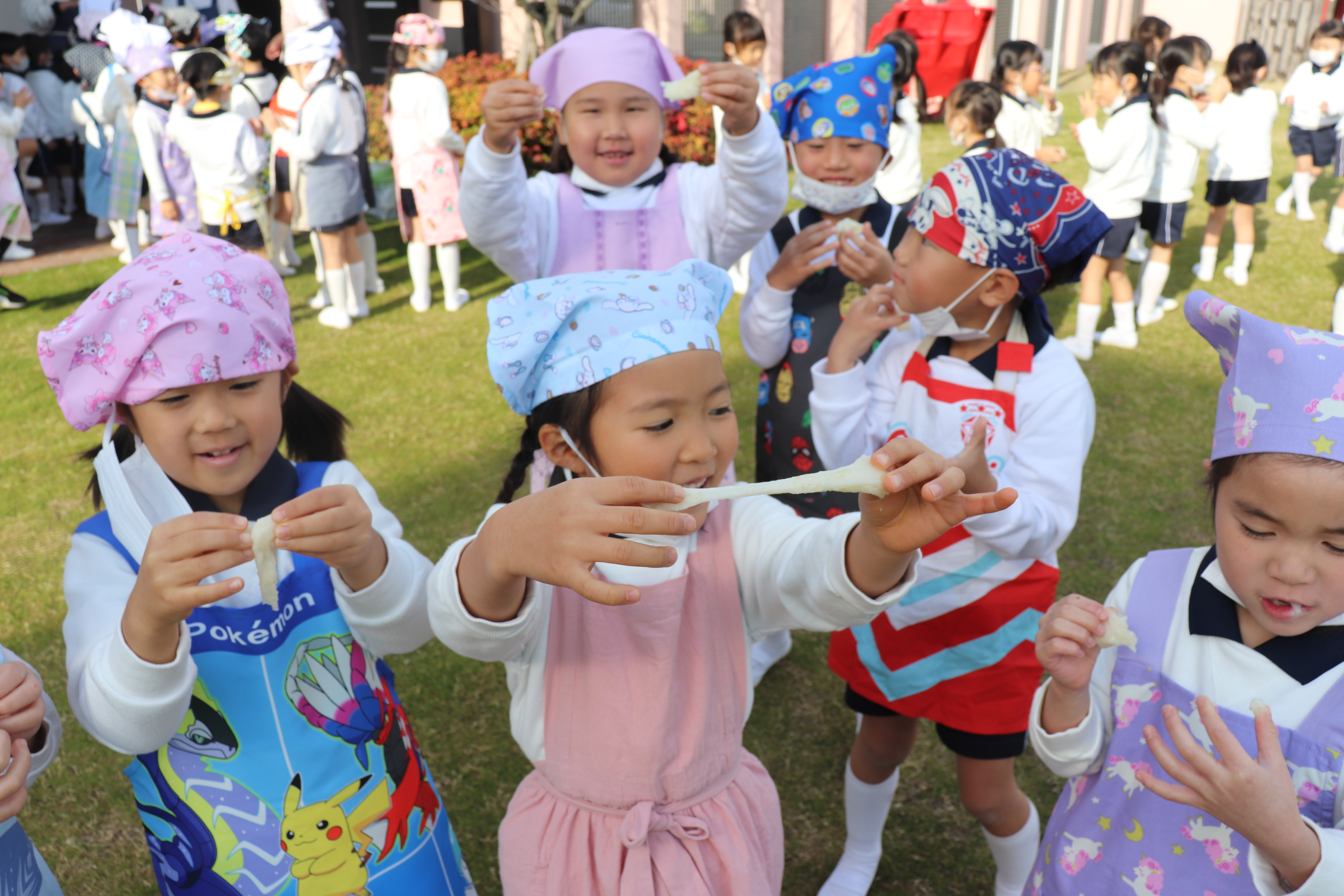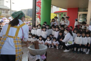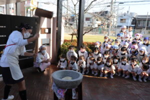 お餅つきに使う道具の名前やお餅つきの由来を教わり、お餅つきが始まるのを心待ちにしていた子ども達。蒸し器に入った白蒸しを不思議そうに見て、先生が杵を持ってつき始めると「よいしょ、よいしょ」と掛け声をかけて応援をする姿が見られました。年長児は、一生懸命に杵を持ち上げてお餅つきに挑戦しました。自分がついたお餅を「美味しい」と嬉しそうに食べていました。3、4歳児もつきたてのお餅を頂き大喜びの子ども達でした。