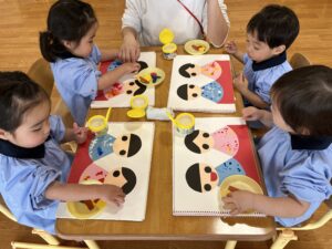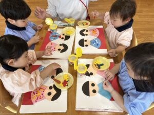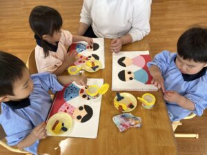 指先に少しずつのりをつけてお内裏様とお雛様の顔に目や口を貼りました。のりを付けた後、紙をひっくり返して貼る事に苦戦しながらも顔が出来上がると「可愛くなった!」と嬉しそうに眺めていました。また、烏帽子や冠なども貼り付けると「出来た!」と先生に知らせ、自分の作品を見せてくれました。