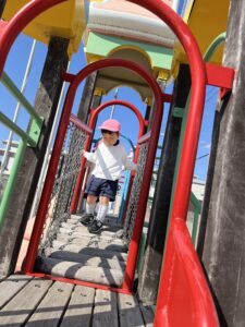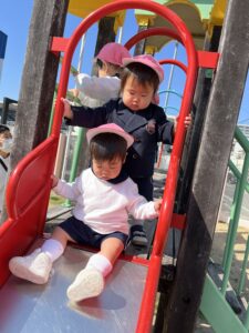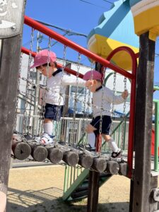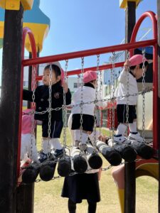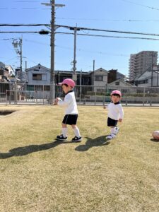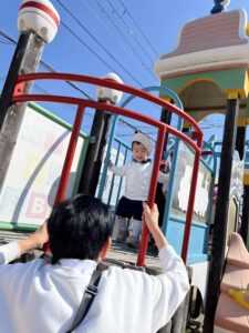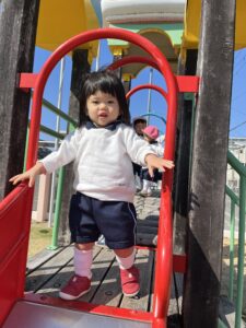 お友達の後を追い、一緒に遊具で遊んだり、ボールやフープを使って身体を動かしたりして、外遊びを満喫していました。