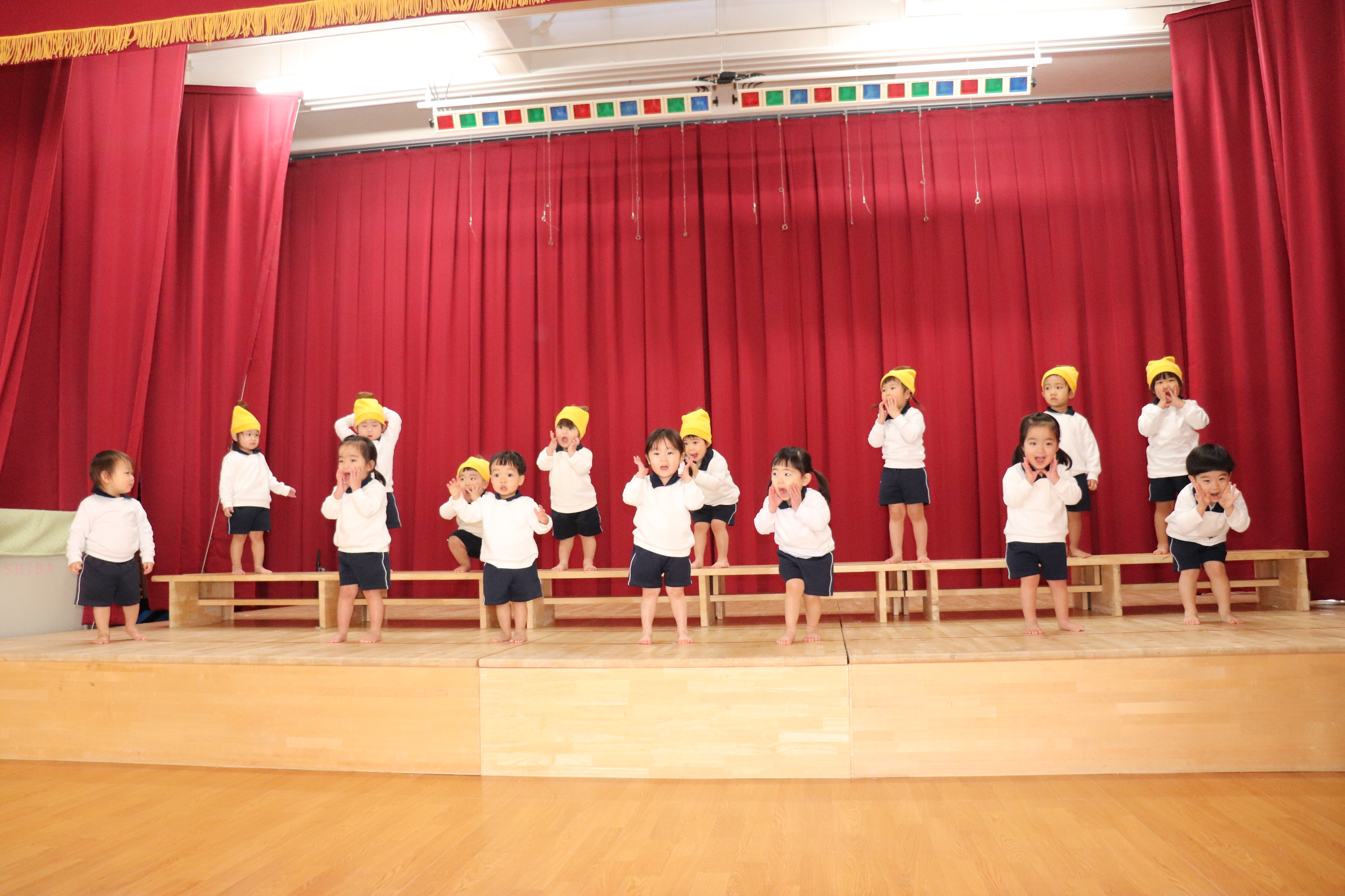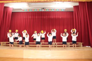 舞台の上でお遊戯をしました。音楽に合わせてお尻を振ったり、バナナに変身したりして楽しんで踊る子ども達。見てくれていたお友達に拍手を送られると嬉しそうにし、一緒に拍手をしていました。