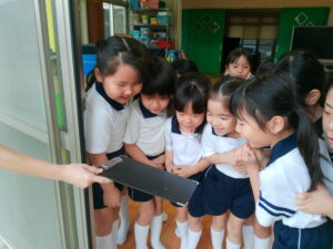 小さいお友達のお遊戯を観覧しました。音楽が流れ一生懸命に体を動かして踊る姿を見ると「可愛い」「頑張れ」と笑顔になっていました。