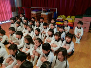 雪が降ってきたのかな?と、外の様子を覗く子ども達。黒い板に白い雪が付いていると、「やっぱり雪だ」と大興奮。急いで園庭に出る準備をしましたが、雪がやんでおり残念そうにしていました。保育室では、「ゆ~きやこんこ♪」と、歌を歌って楽しみました。