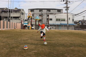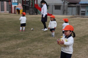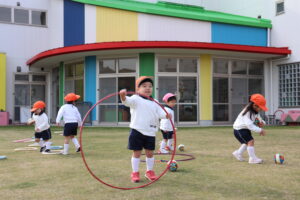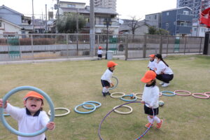先生を捕まえようとしたり、先生の姿を確認しながら駆け回ったりする子ども達。また、ボールを蹴って追いかけたり、地面に並べたフープの上を進んだりと、たくさん身体を動かしました。