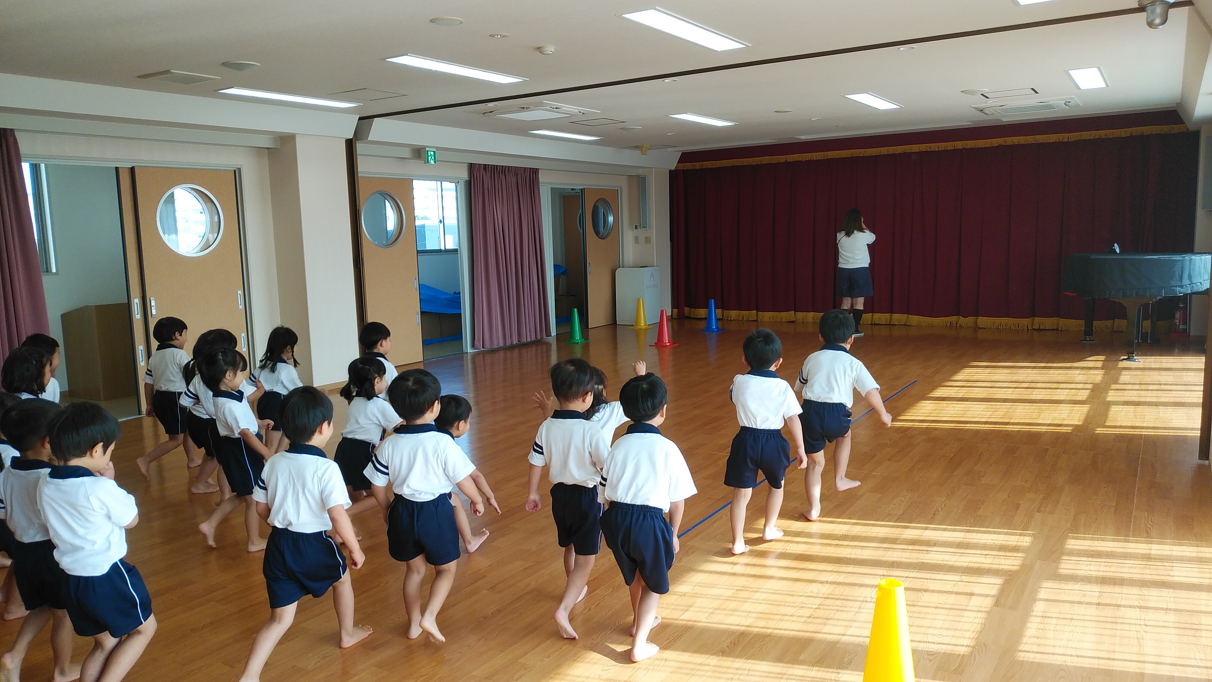 「だるまさんが転んだ」をしました。ルールを知っている友達に続いて同じように進んだり、止まったり、ポーズをとったりする子ども達。上手にぴたっと止まり、更に回を重ねる事に様々なポーズをし、氷のように固まっていました。そして、鬼に近づきタッチをすると捕まらないように室内中を駆け回る子ども達。「キャー!!」と声を上げながら一生懸命逃げ回り、タッチをされた友達は、次に鬼になりました。「楽しい」「また遊ぼうね」「またしたいな」と次回を楽しみにしている子ども達です。