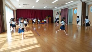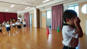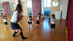 「だるまさんが転んだ」をしました。ルールを知っている友達に続いて同じように進んだり、止まったり、ポーズをとったりする子ども達。上手にぴたっと止まり、更に回を重ねる事に様々なポーズをし、氷のように固まっていました。そして、鬼に近づきタッチをすると捕まらないように室内中を駆け回る子ども達。「キャー!!」と声を上げながら一生懸命逃げ回り、タッチをされた友達は、次に鬼になりました。「楽しい」「また遊ぼうね」「またしたいな」と次回を楽しみにしている子ども達です。