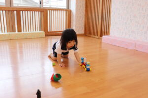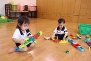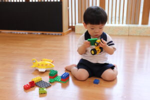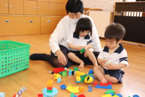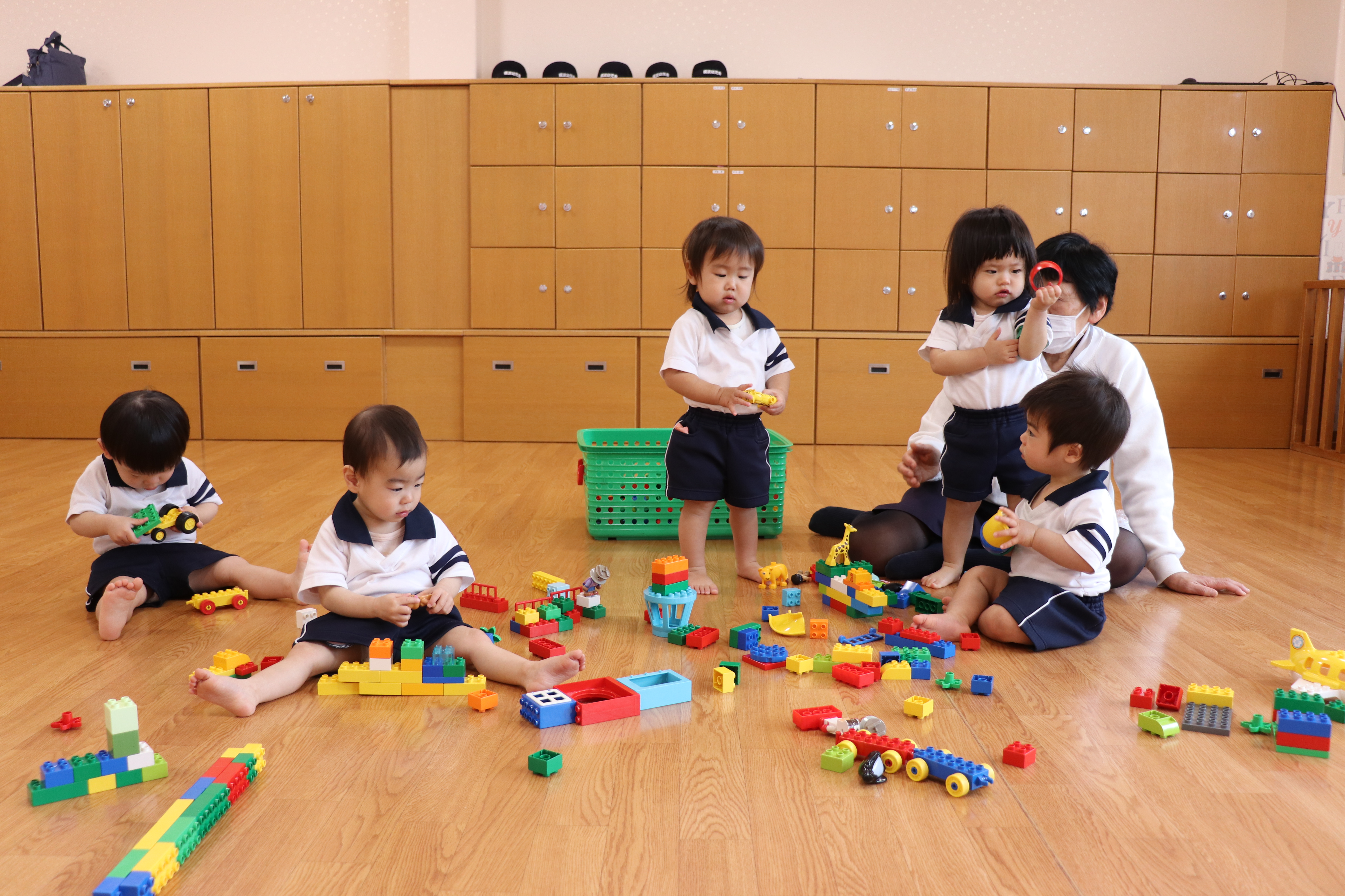 好きな形や色のブロックを自分で選び、つなぎ合わせていました。「上手」「出来たね」の言葉に手を叩き、笑顔を見せていました。