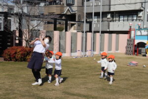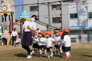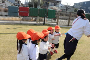 みんなでネコ役になり、尻尾をたくさんつけたネズミ役の先生を追いかけました。「待て~!!」と一生懸命追いかける子ども達。やっとの思いで尻尾を取ることが出来ると、「取った!!」と嬉しそうに見せていました。ネズミの尻尾が全部なくなると、「なくなった」「もう1回する!」と遊びを楽しんだ子ども達でした。