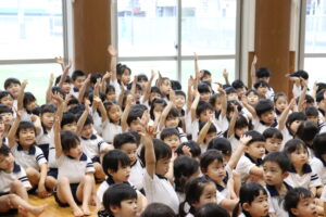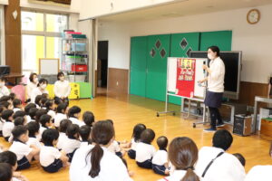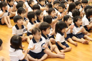 ひなまつりのパネルシアターを見ました。「うれしいひなまつり」の歌に合わせて、ひな人形が飾られていくのを見ながら、にこやかな表情で一緒に歌う子ども達。完成すると、大きな拍手が聞こえてきました。ひなまつりの食べ物クイズでは、自信たっぷりに答え、正解すると「やったー!」と大喜び!ひな人形やひな飾りの名前、ひなまつりの日にちらし寿司や蛤のお吸い物、ひなあられを頂く理由などについて知り、心待ちにしていたひなまつりを楽しむ子ども達でした。