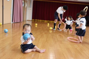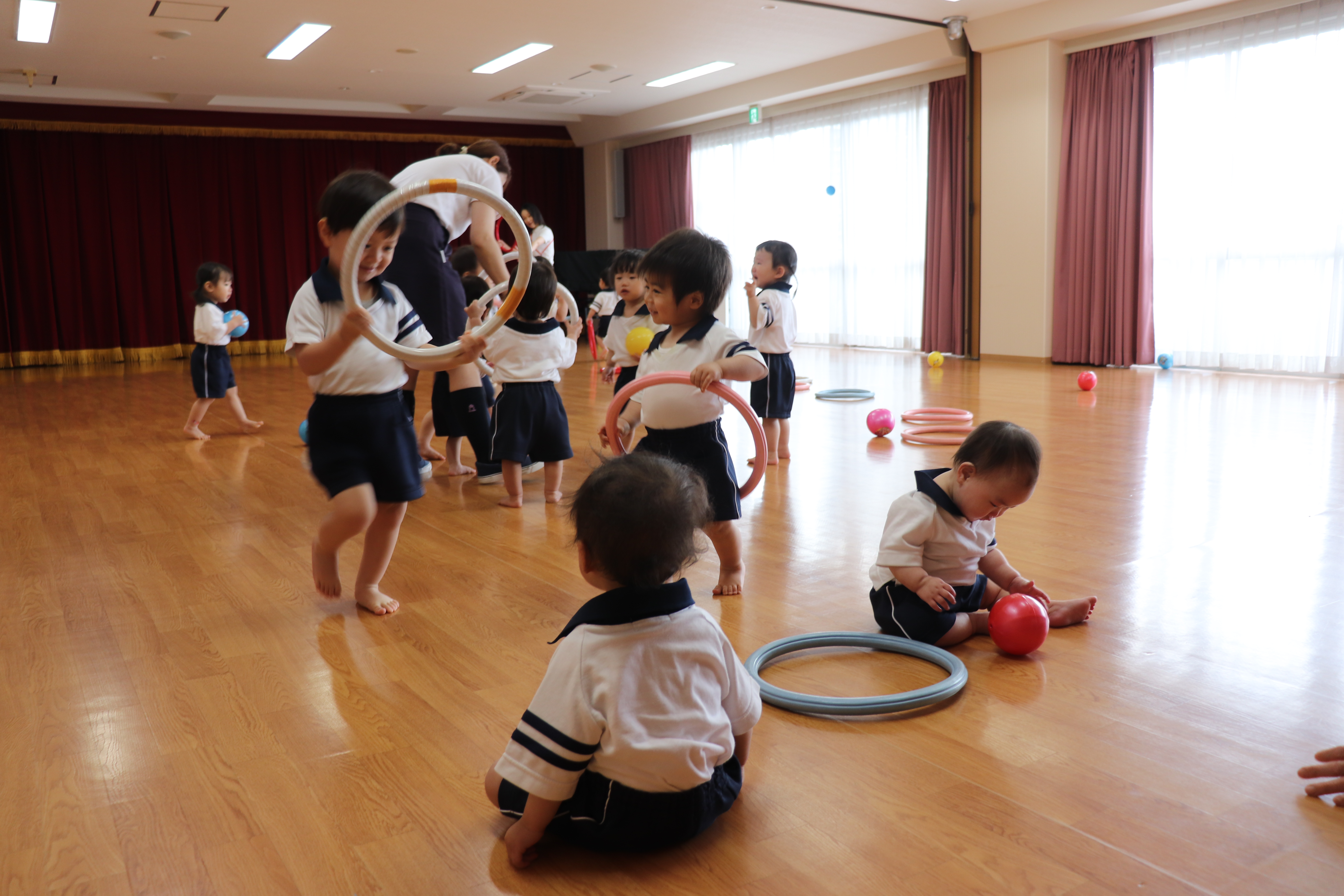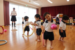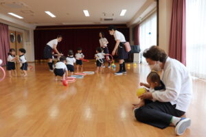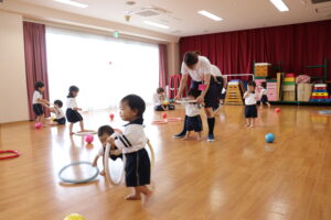 「それ~」と先生がボールを投げると、笑いながら追いかけていました。フープをハンドルに見立てて乗り物ごっこをしたり、「歩こう」の言葉に促されて歩いたりし、ホールでたくさん身体を動かしました。