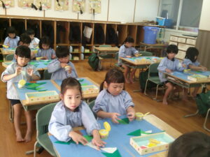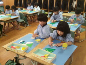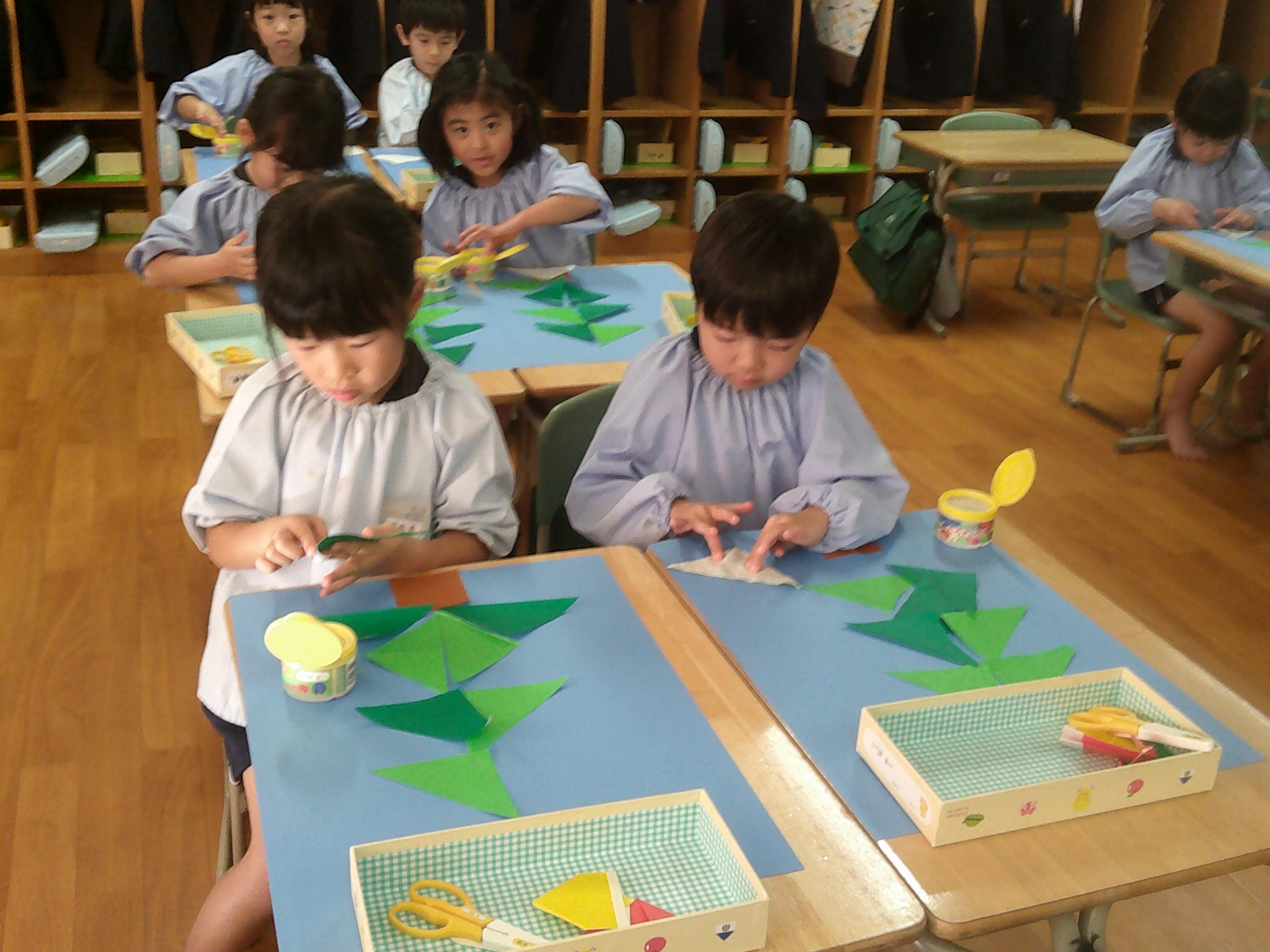 緑と黄緑の折り紙をそれぞれ三角に2回ずつ折り、折った線の上をハサミで切って小さな三角を8つ作りました。作った8つの三角を使ってツリーの形を作りました。大きな三角を作って重ねたり、小さな三角のまま一番上に置いたりして形を考える子ども達。「先生、大きな三角より大きくできた!」と気付くお友達がいました。真ん中に四角を斜めに置いて作りその下に三角を置くとより大きな三角が出来る事を知ると、「本当だ」「出来た!」と自分で作っていました。「先生見て、素敵なツリーにした」と緑と黄緑を組み合わせた配色にするなど、色や形を考えながらツリーの形が出来ると、三角の周りに糊を付けて糊付けていました。茶色の折り紙の幹も糊付けし、「大きな木になった!」と喜んでいました。