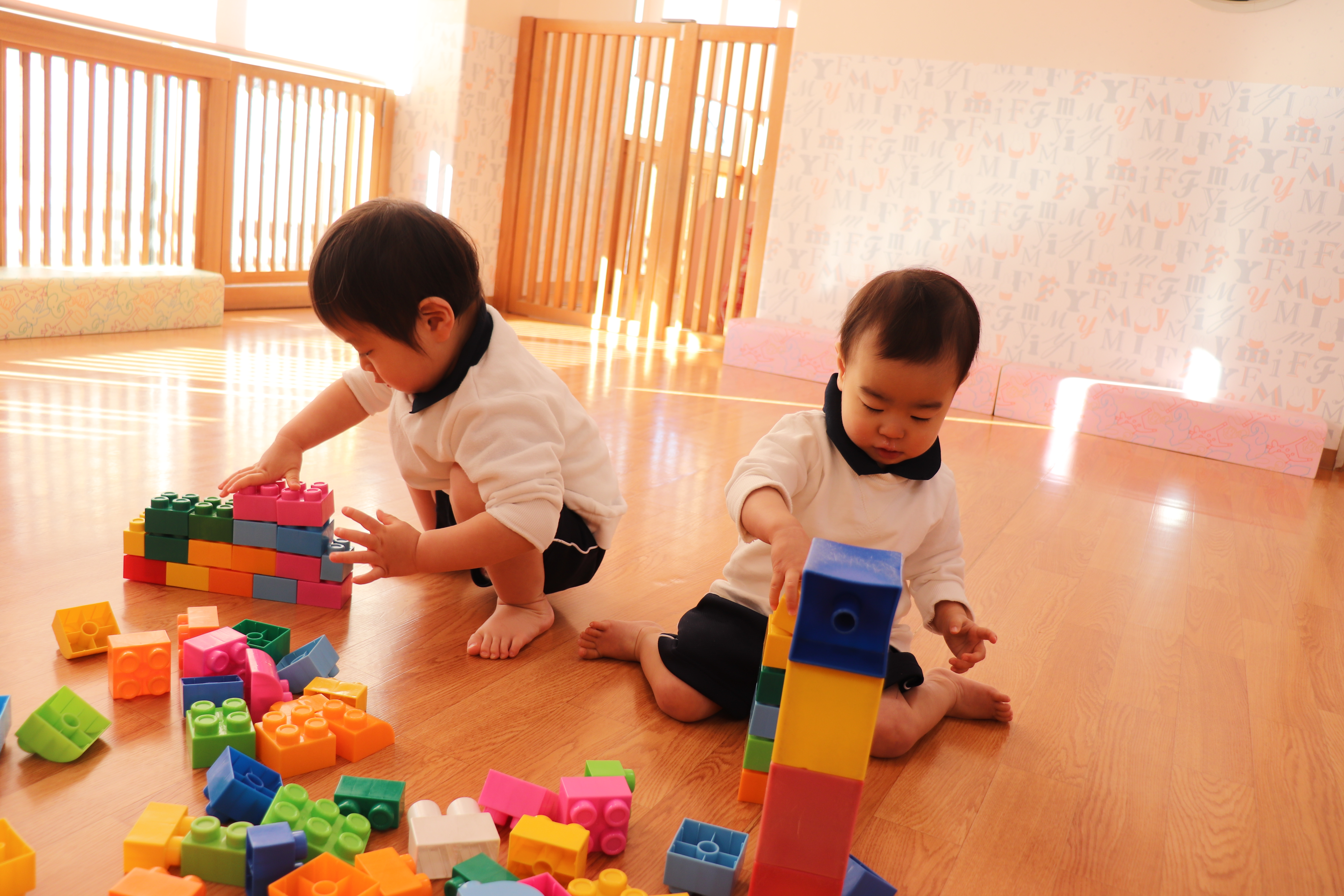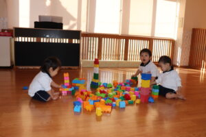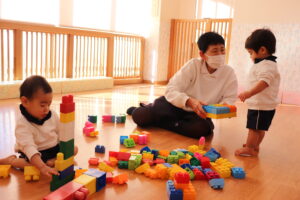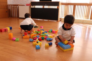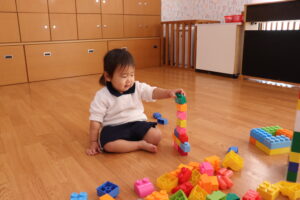 先生と一緒にブロックを組み立てていくと、とても真剣な表情で指先を動かし続けていました。
