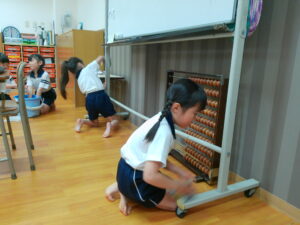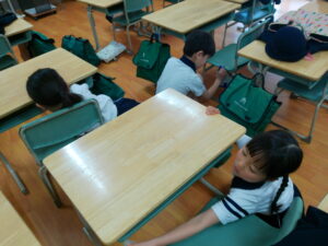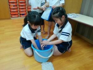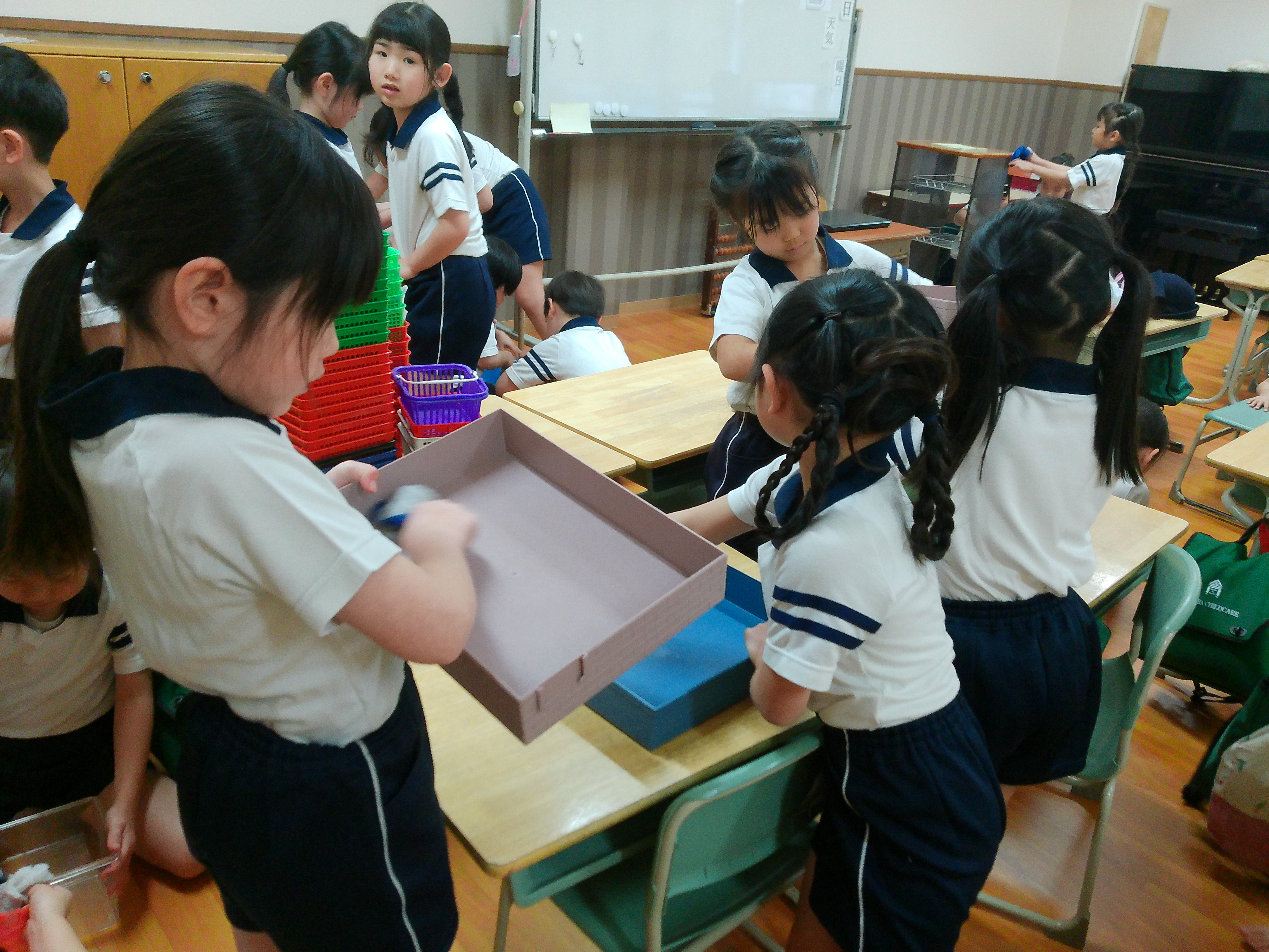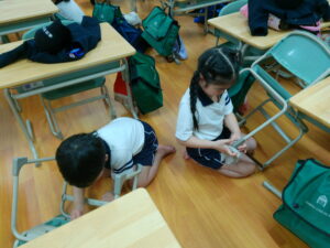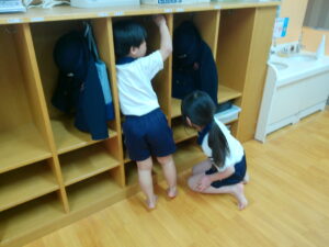 自分達が使った机、椅子、ロッカー、保育室内の全ての物を、次のらいおんぐみのお友達が気持ちよく使えるように、そして、今まで使った物に、ありがとうの感謝の気持ちを込めて大掃除をしました。「ピカピカになってきた」「まだ、ここも綺麗にする」「もう、無いかな?」など、まだ掃除してないない場所を自分達で見つけて、綺麗にする子ども達。掃除を終えると「気持ちがいいね」と、笑顔になっていました。