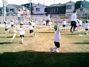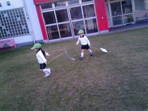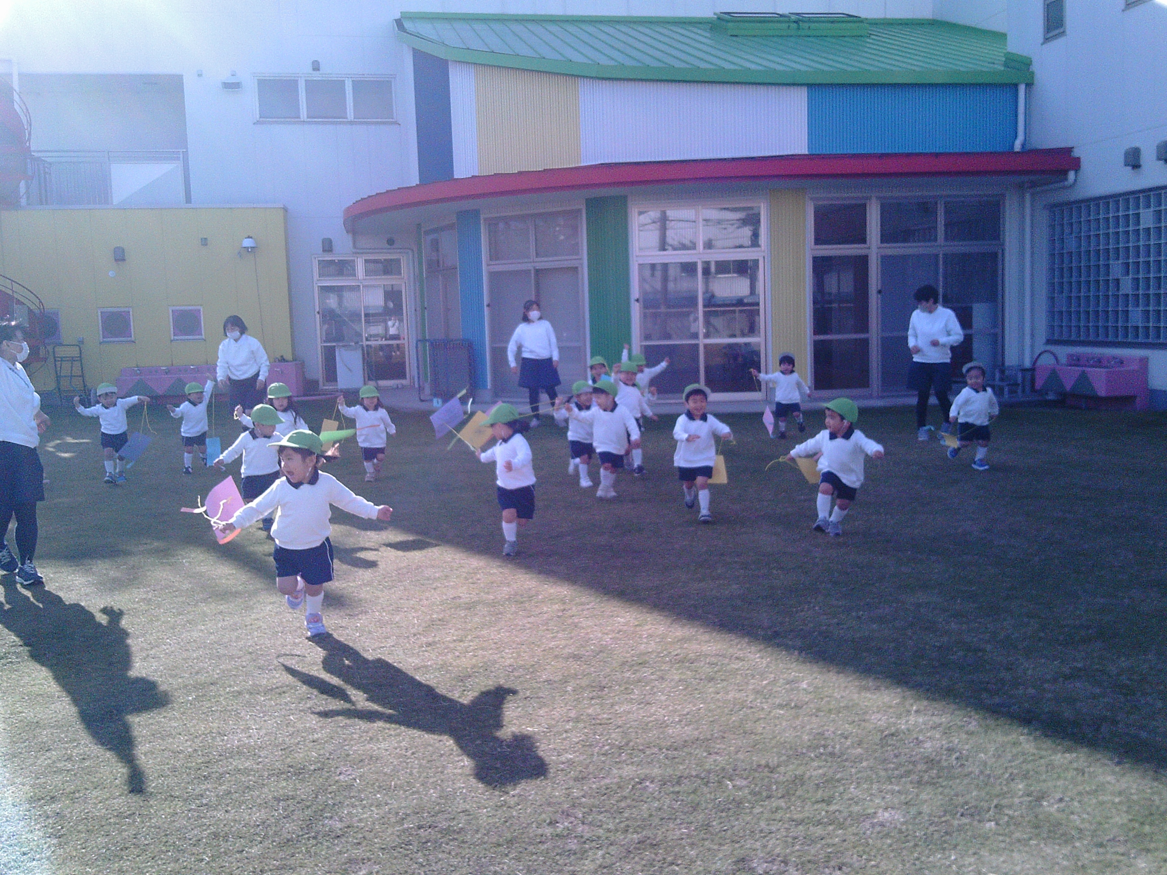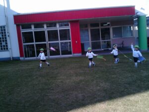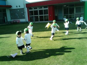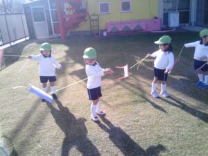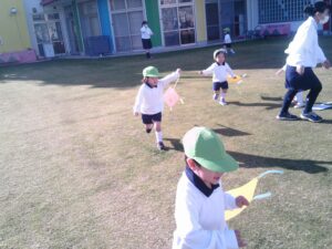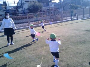 「昨日作った凧だ!」と嬉しそうに手に持つ子ども達。「見て~!」「凧あがったよ!!」と言いながら園庭を駆け回っていました。時々後ろを振り返り凧があがる様子を見たり、紐の持つ位置を変えて高く凧があがるようにしたりして凧あげを楽しんでいました。