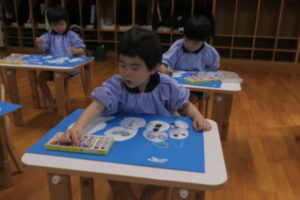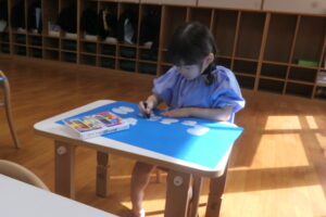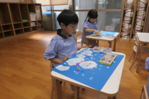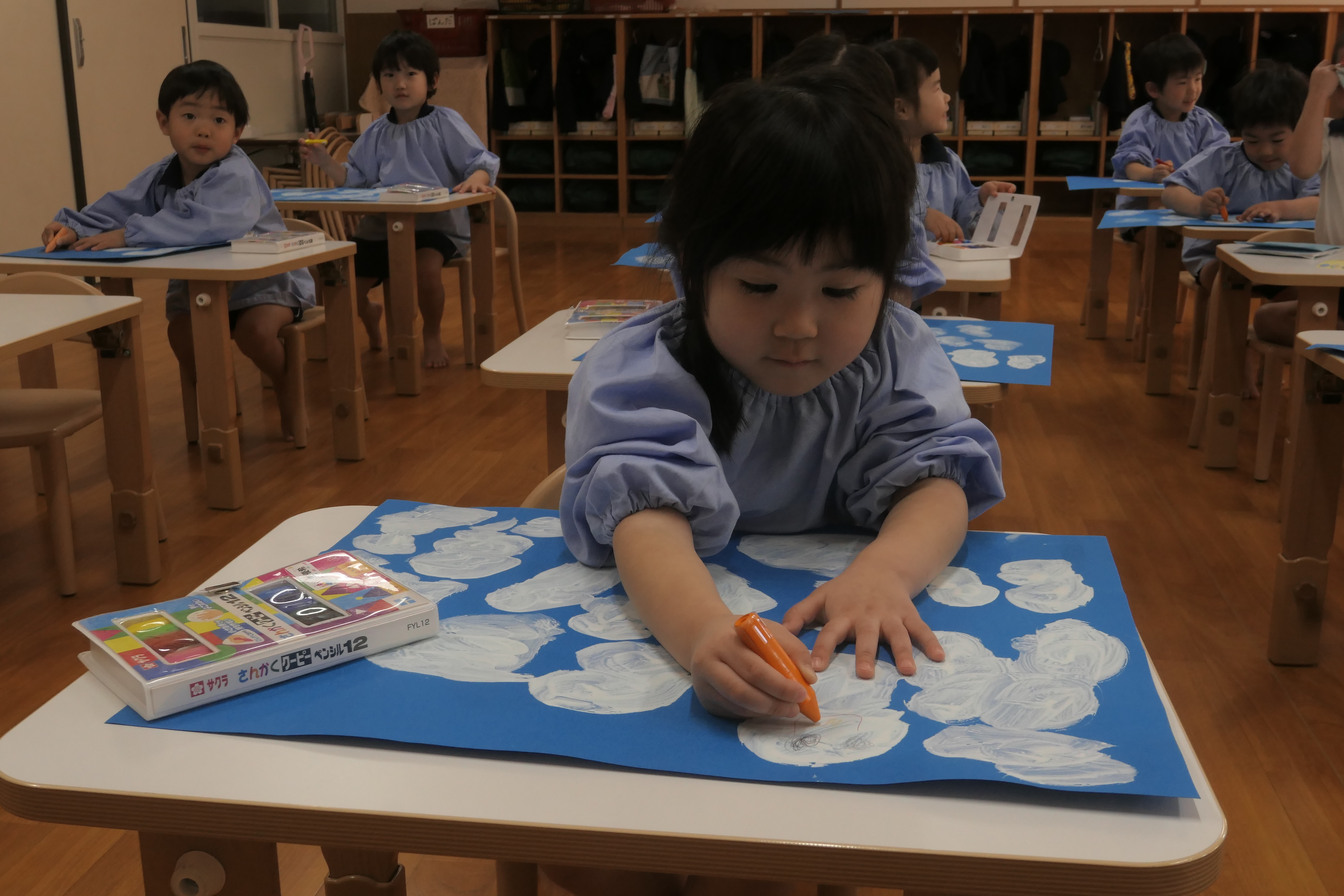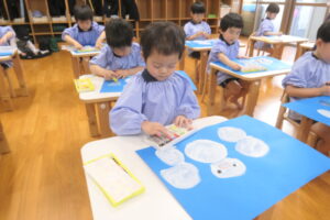 雪だるまのパーツをクーピーやクレパスで描きました。「目」「口」「鼻はにんじん」「帽子」「手!手は枝」「手袋」「マフラー」「ボタン」と雪だるまの特徴を話す子ども達。思い思いに様々な色を使って描くことができ、1体1体違った表情や持ち物を描いたり、同じ雪だるまにしたり、様々な可愛い雪だるまが完成しました。周りには雪を沢山降らせ出来上がりに大満足の子ども達でした。