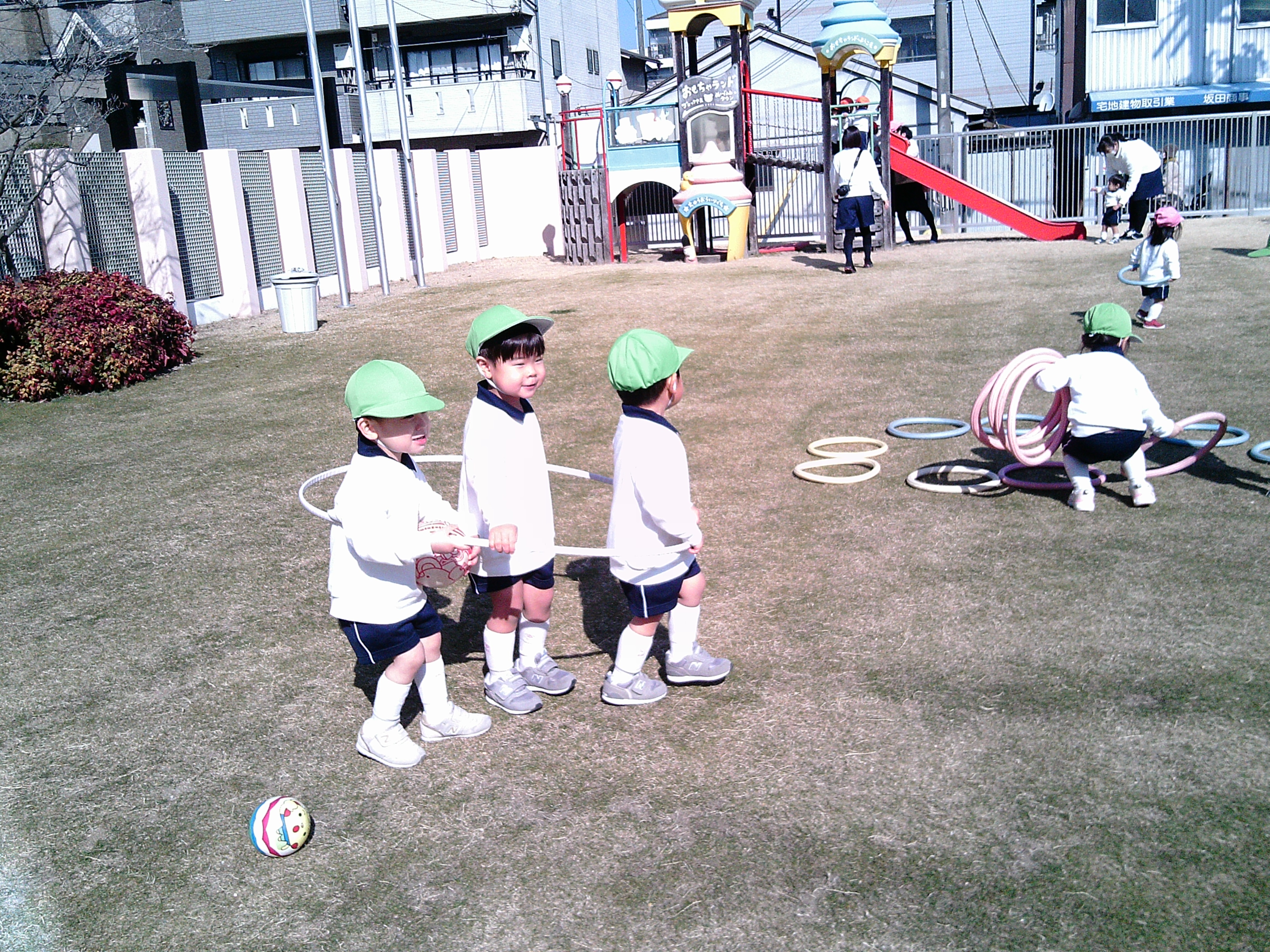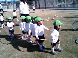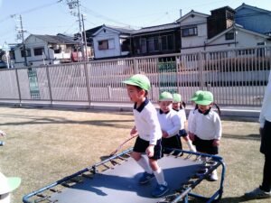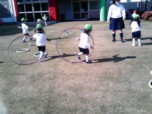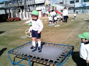はじめはひとつのフープに入って電車ごっこをしていた子ども達。「連結しよう!」と声を掛け、たくさんのフープがつながって長い列車ができ、「長いでしょ!」「行ってきま~す!!」と先生に手を振っていました。「それ~!」と言いながらフープを転がしたり、並べて跳んだり、トランポリンをしたり元気いっぱい遊ぶ子ども達でした。