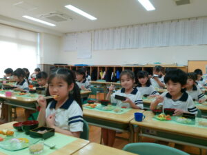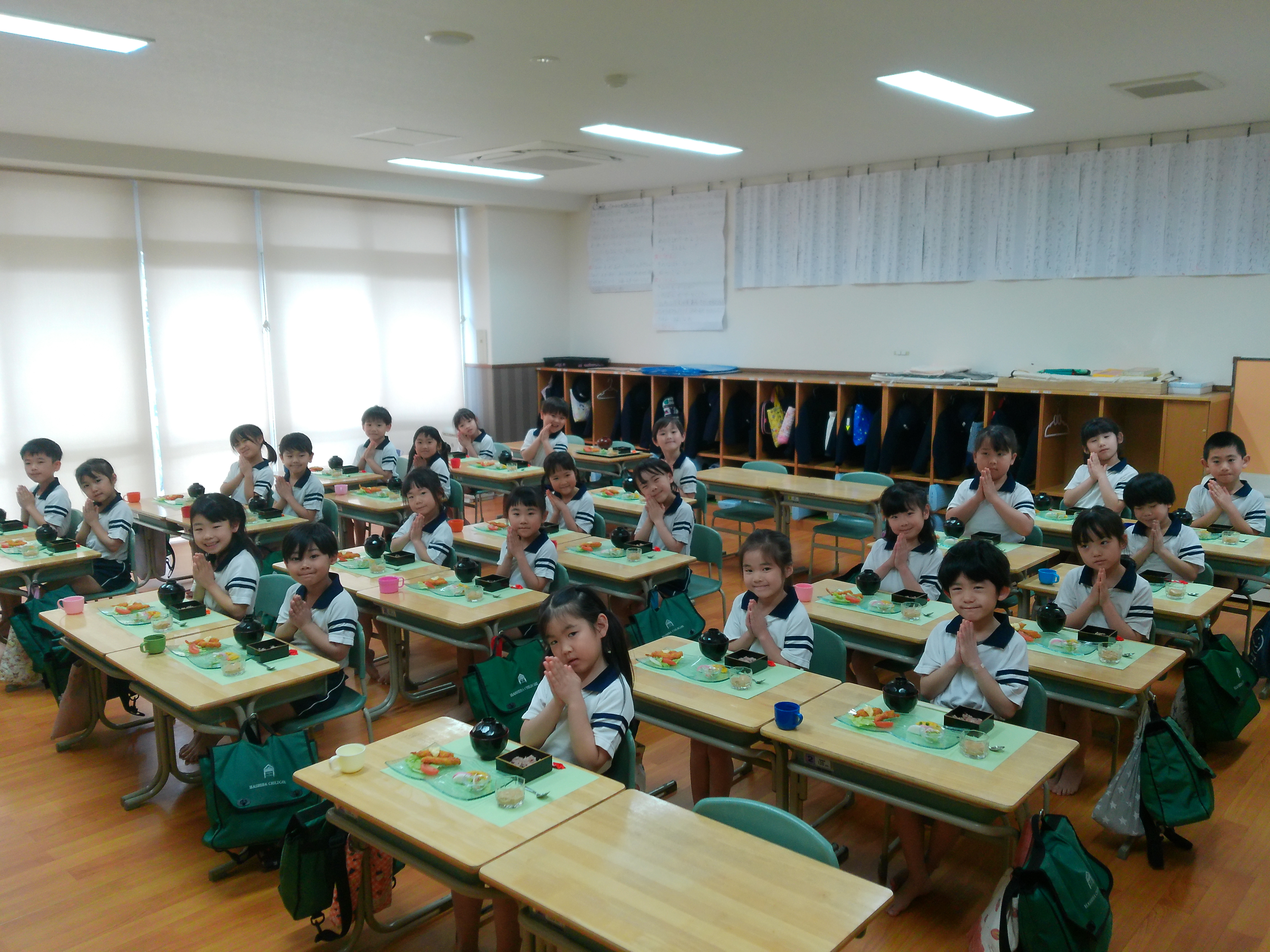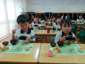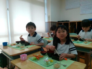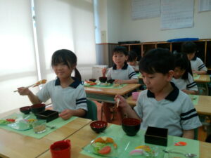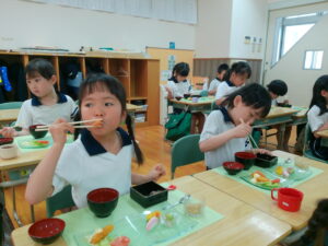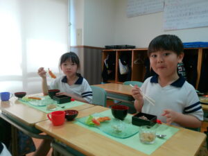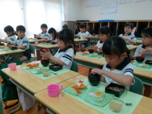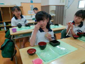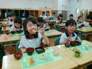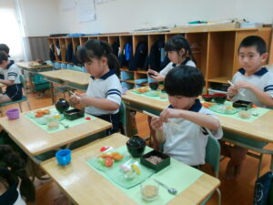 お料理が配膳されると「海老フライ、大きい!」「お赤飯だ!!」と大喜び。“卒園のお祝い膳”、お赤飯、紅白のかまぼこ、大きな海老フライなどのお料理に目を輝かせ、釘付けになっていました。今までに教わった割箸の割り方、正しいお箸の持ち方、お椀の蓋の開け方、置く位置、お料理の頂き方、姿勢などを意識しマナーを守り、感謝の気持ちを持っていただきました。一口食べるごとに「美味しい」と、笑顔になる子ども達でした。