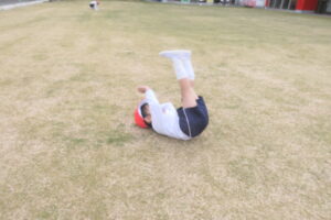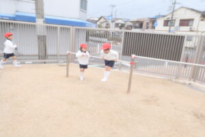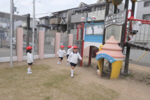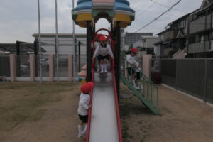 大型遊具や鉄棒を使って遊びました。園庭中を走り回って鬼ごっこをしたり、芝の上で前転後転をする子どもも多くいました。キャッキャ声を上げて全身を動かし友達と遊ぶことを楽しんでいました。「あんまり寒くないね」「寒いのどっか行ったね」と気温の変化にも気づく子ども達でした。
