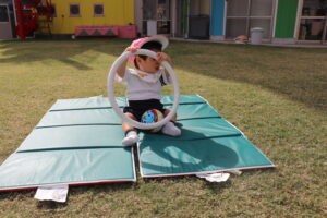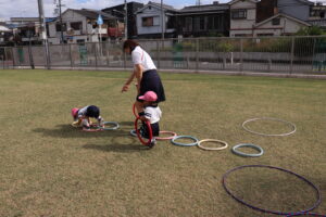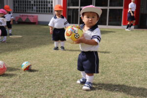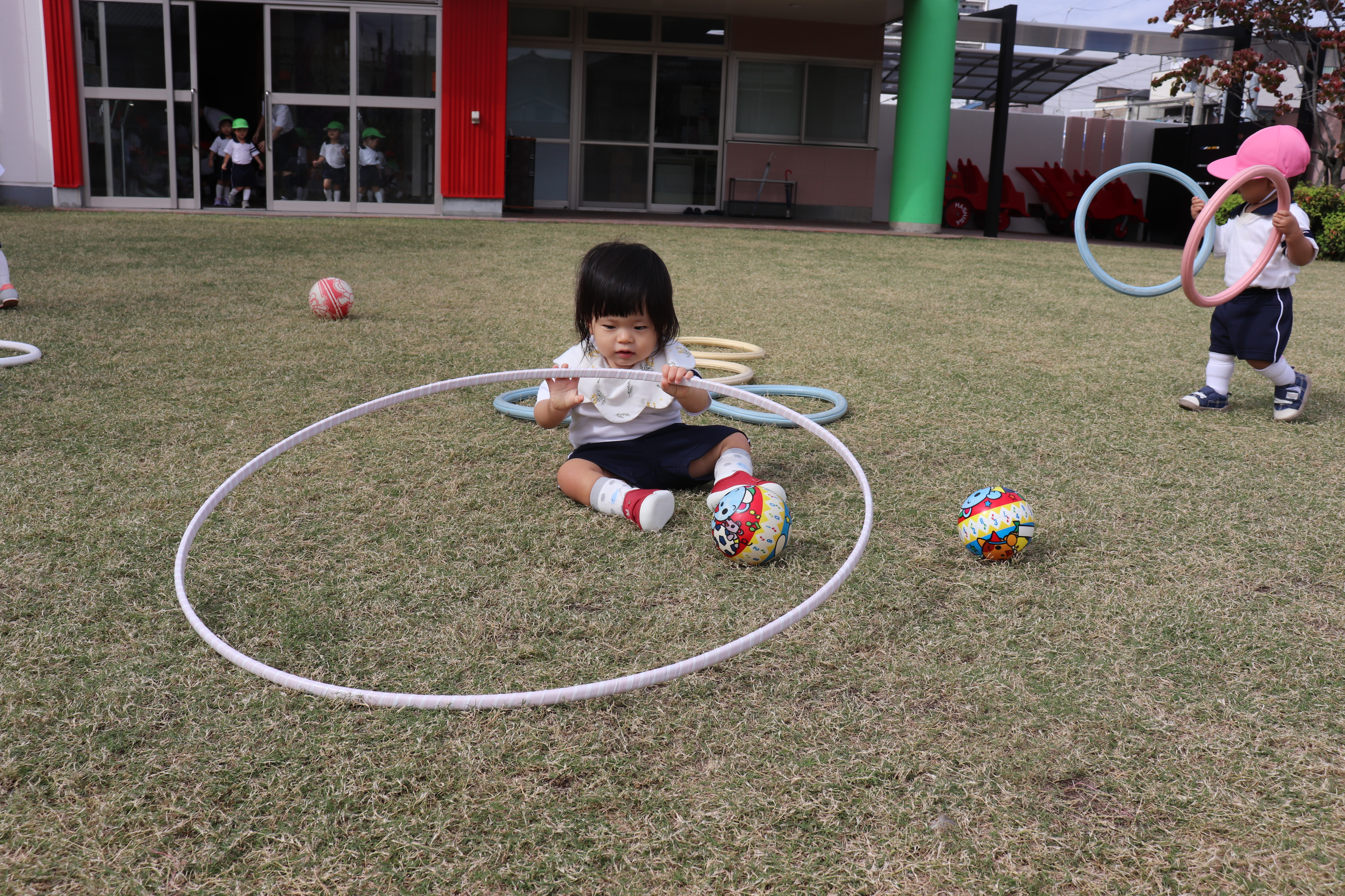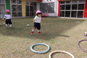 「お外に行こう」の声掛けに、嬉しそうな表情を見せて、自分で帽子や靴下を手に取っていました。たくさん遊んだ後は、みんなで美味しくお弁当を頂きました。