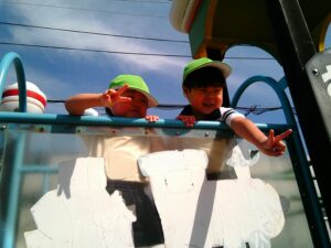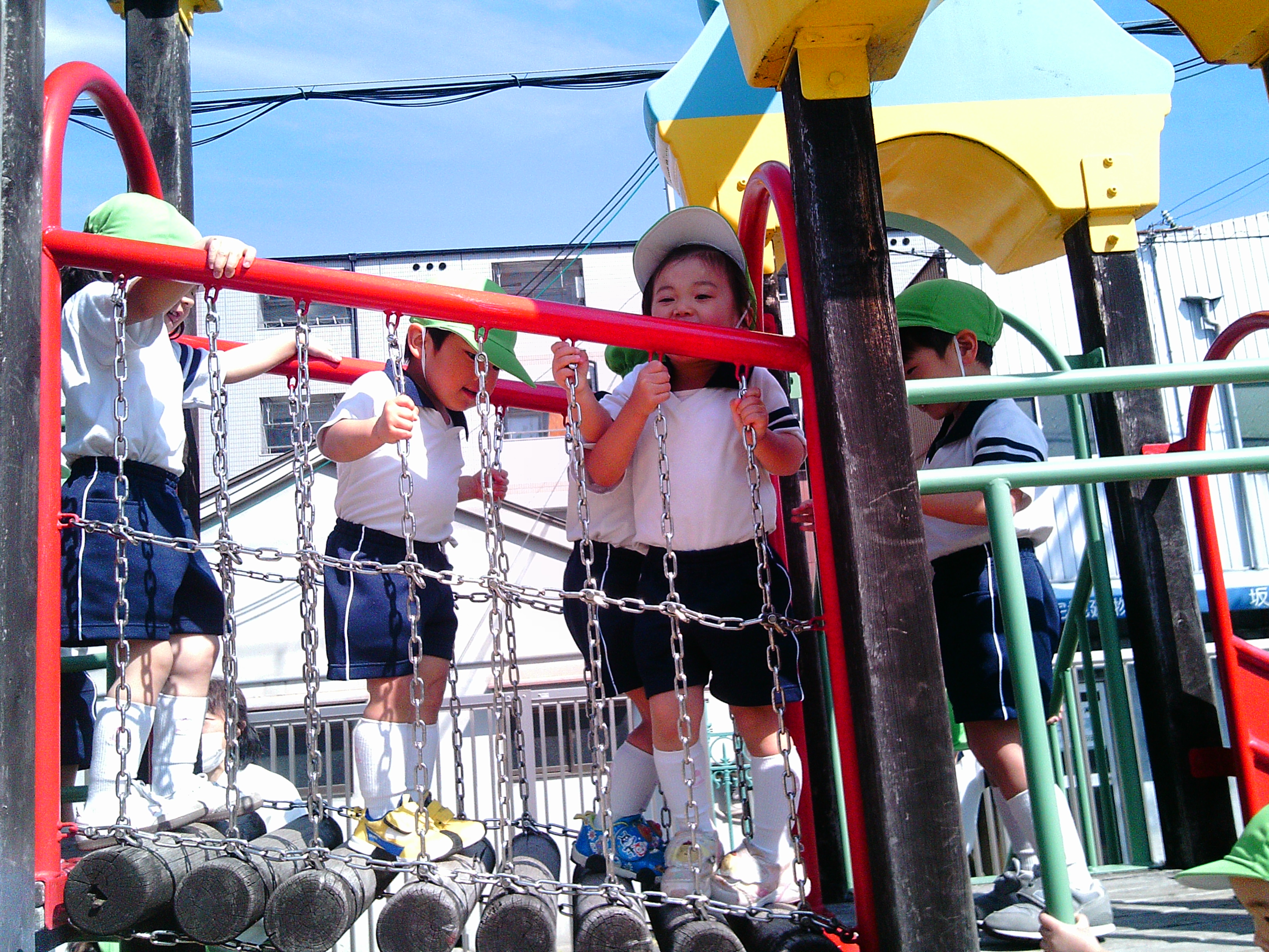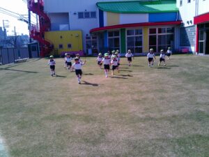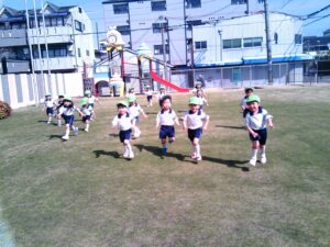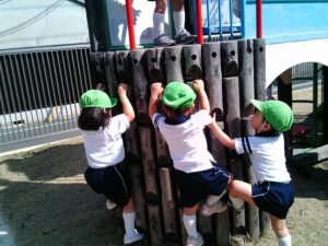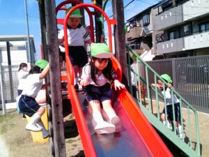 園庭でかけっこをしたり大型遊具で遊んだりしました。かけっこでは「キャー!」と声を出しながら走り、大型遊具では、滑り台を滑ったりつり橋を渡ったりして、楽しんでいました。たくさん身体を動かし、保育室に戻る時には「暑い~!」と話していた子ども達でした。