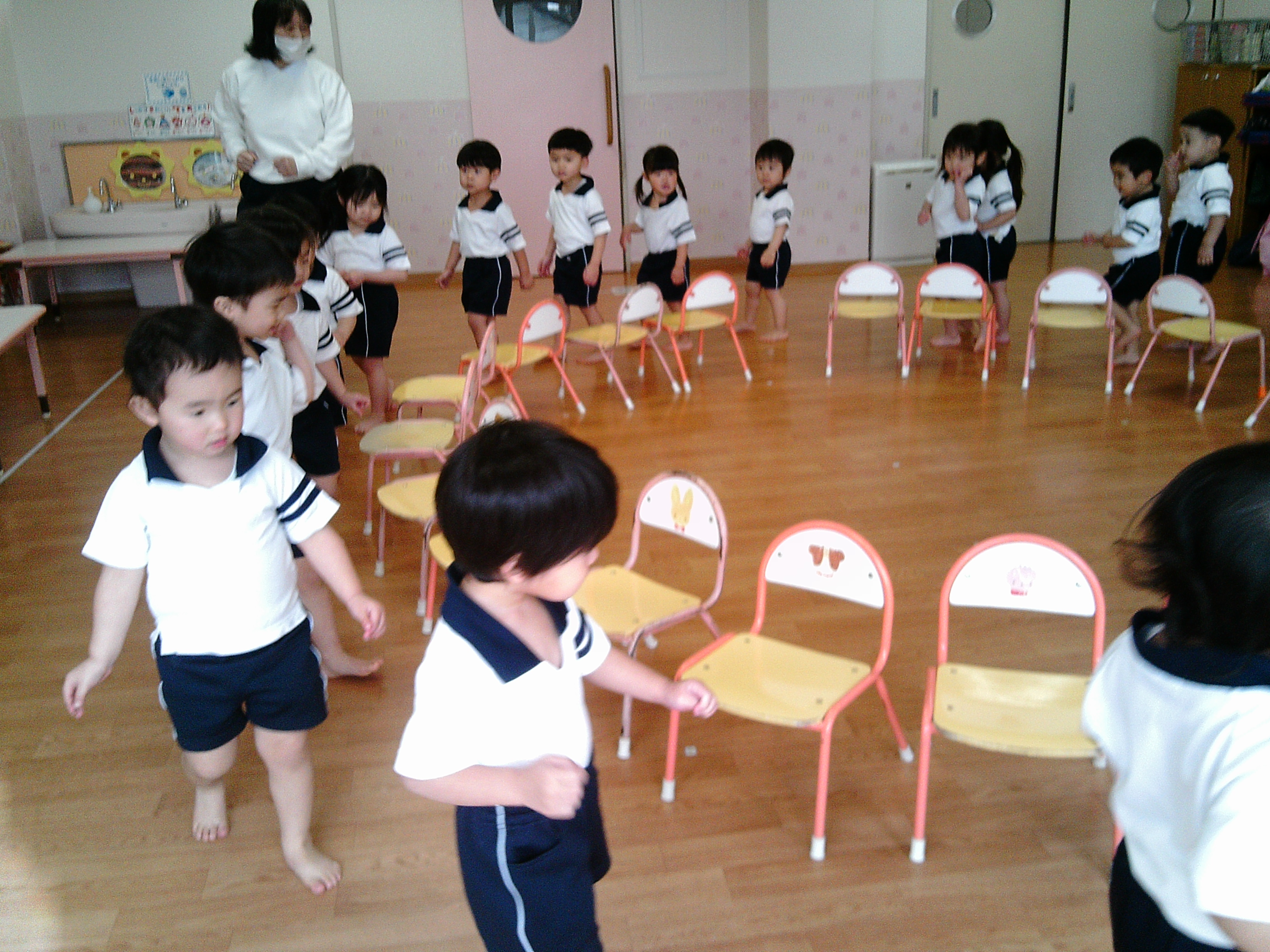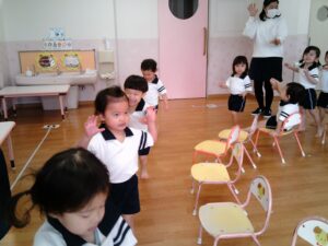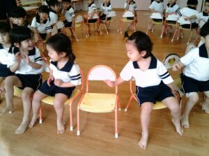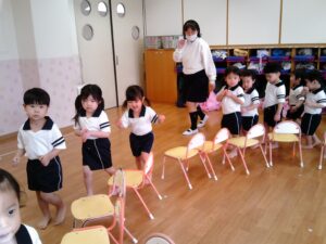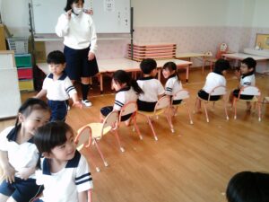 椅子取りゲームをしました。音楽が止まると空いている椅子を探して座る子ども達。先に座ったお友達は「そこ空いてるよ!」と指差して知らせたり、「座れてよかったね!」と声を掛けたりする微笑ましい姿が見られました。音楽に合わせて歩く速さを変えたり、ライオンやリスなどの動物に変身したりして楽しみました。