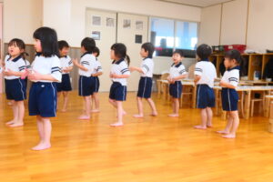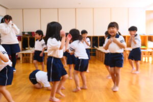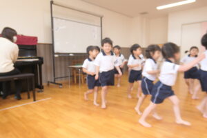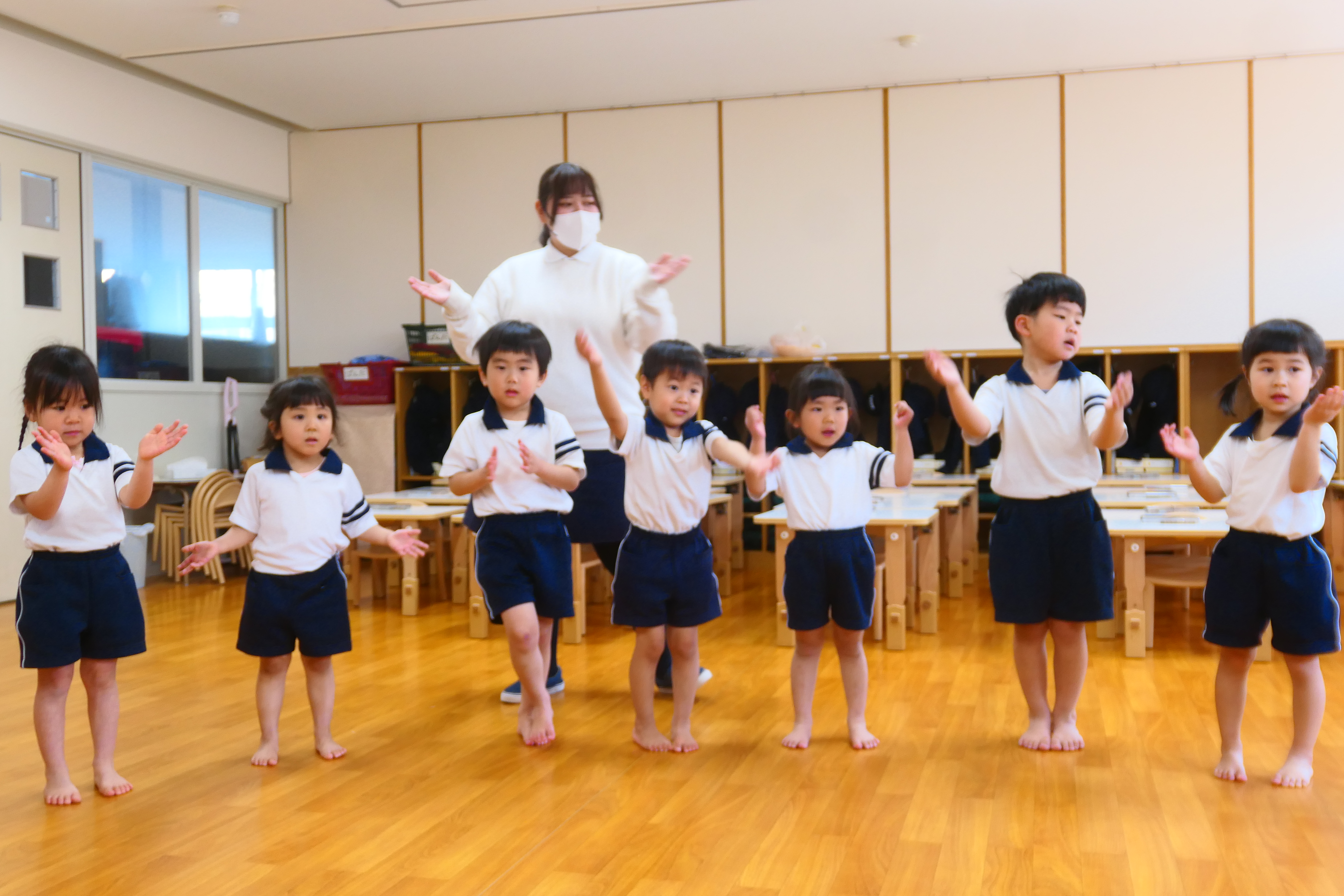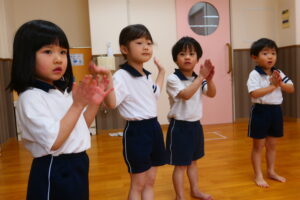 ピアノに合わせて身体を動かしたり、音階を声に出したり、手拍子したりしました。初めはしっかり音を聞こうと真剣な表情の子どもたちでしたが、慣れてくると笑顔いっぱいで楽しんでいました。拍を意識して手拍子をすることが出来ていました。