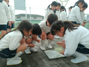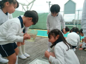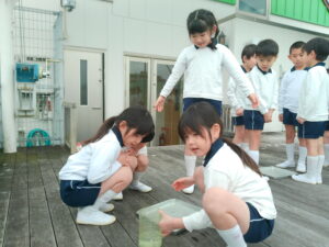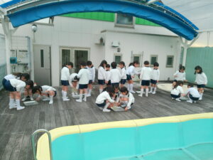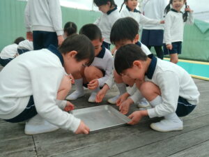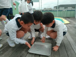 朝とても寒かったので、プールの水が凍っているかもしれないと思い、みんなで見に行きましたが、凍っておらず残念がる子ども達。しかし、プールサイドの蛇口の下に氷が張っているのを見つけると「凄い」と、はしゃいでいました。グループに分かれて水の量や容器を置く場所などを決めて、氷作りに挑戦しました。「明日、凍ってたらいいな」「楽しみ」「もっと、寒くなったらいいのにな」と、期待に胸を膨らませ、ワクワクしながら容器に水を入れる子ども達でした。