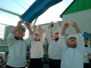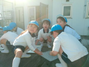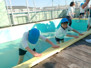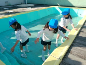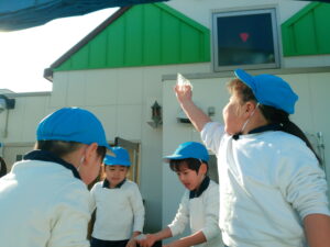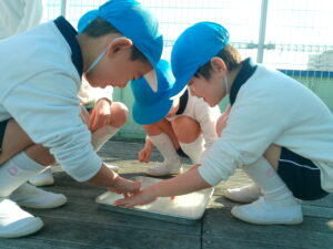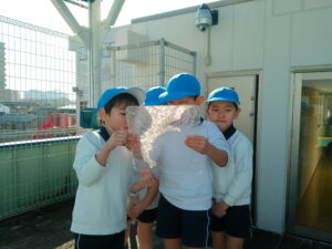 登園すると「氷、出来ているかな?」「早く見に行きたいね」と、お友達と氷の話で盛り上がっていました。厚みのある氷が出来ていると「凄い!!」「キラキラしている」「冷たい」「実験、大成功!!」と喜び、触ったり光に当てたりして楽しんでいました。プールの水が凍っていたので、スケートも楽しみました。