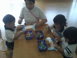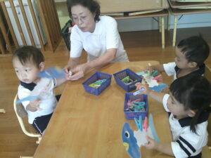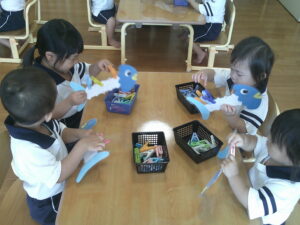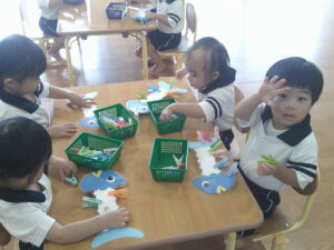 洗濯ばさみ(1歳児クラス) 2025.10.07 洗濯ばさみを魚の台紙につけて遊びました。指先を使って開閉することが上手になってきた子ども達。黙々と台紙につけて嬉しそうに見せたり、「パクッ」とつぶやきながら台紙につけたりする姿が見られました。
