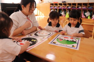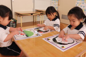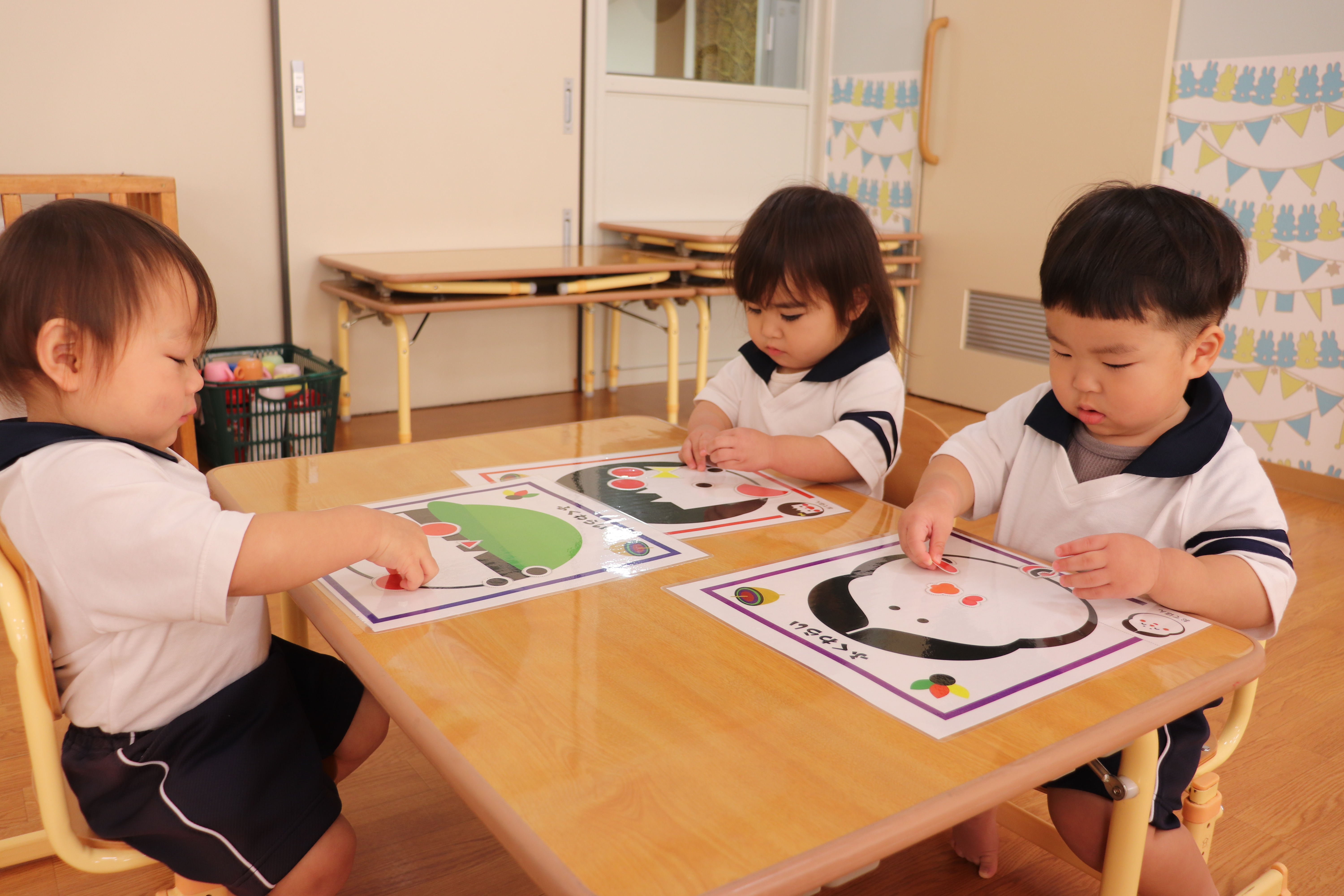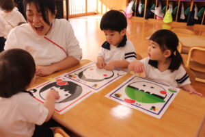福笑いをしました。先生に「目はどれ?」と尋ねられると、パーツの中から探して「あった!」と顔の上に置いていました。見本のように置いたり、思い思いの場所に置いたりし、楽しんでいた子ども達。「面白い顔になったね」と先生が笑うと、一緒に笑っていました。