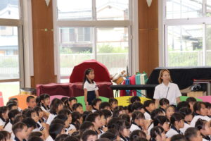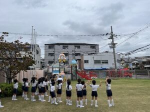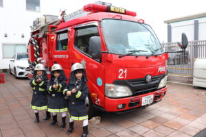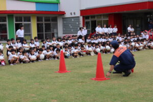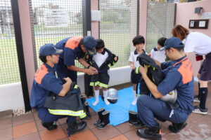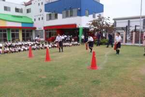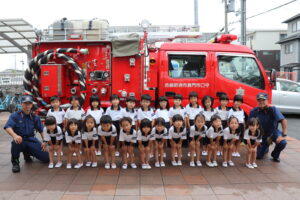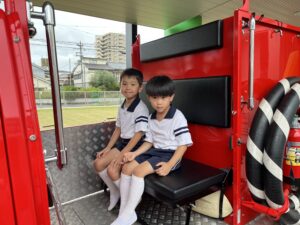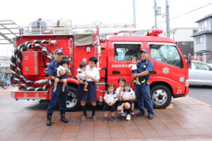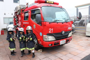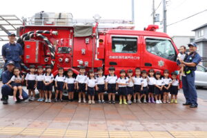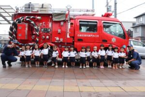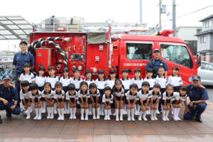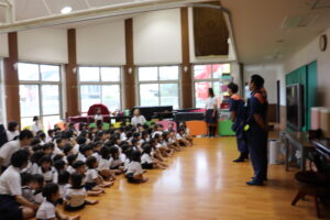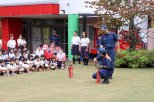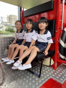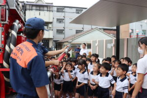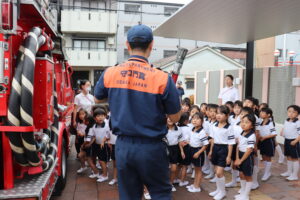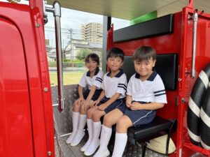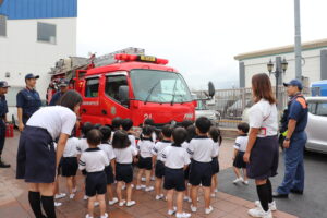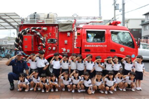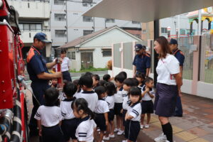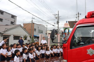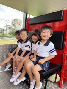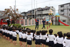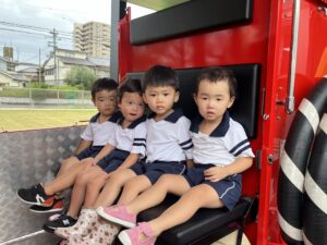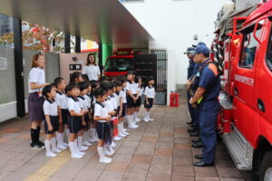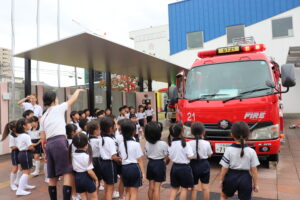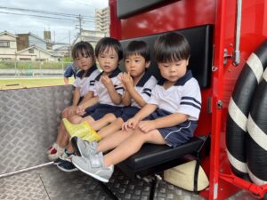 総合避難訓練を行いました。消防署の方からも通報から避難まで、「とても上手に出来ていました」と褒めていただき、友達と顔を見合わせて笑顔を浮かべていました。 先生の消火訓練を見たり、消防車の見学、乗車をさせて頂いたりしました。また、年長児の子ども達が園児代表で消防署の方に質問をし、防火服を着背て頂いたりしました。消防署の方々から様々な話を聞して頂き、興味、関心を持っていました。 消防車見学では、実際に給水口にホースを挿したり、サイレンを鳴らしたりして下さいました。貴重な話や体験に子ども達も興奮し、喜んでいました。 ミニ消防車にも乗せて頂き、「すごいね」「座るところふかふか」「運転席は機械がいっぱい」気付いたことを先生や友達と沢山話し、満足気な子ども達でした。