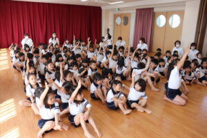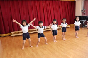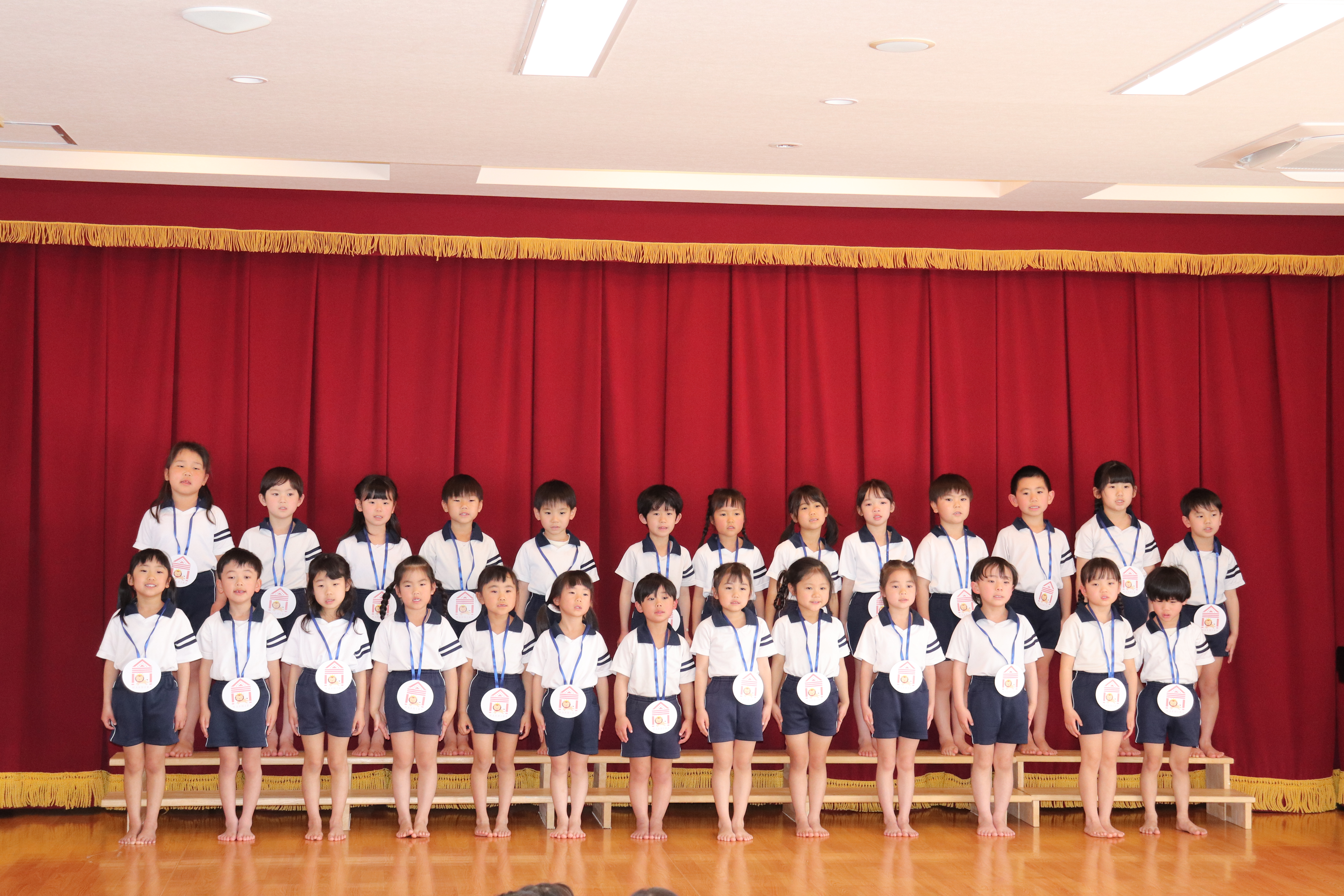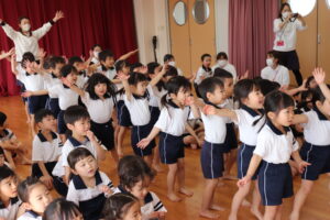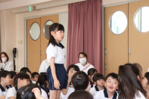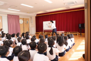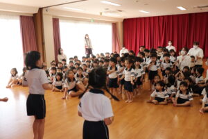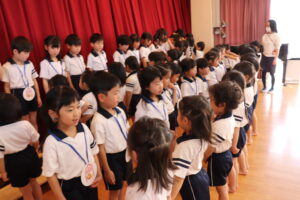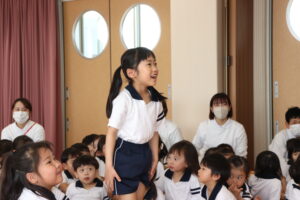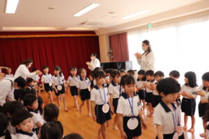 卒園を迎えるらいおんぐみのお友達に感謝の気持ちを込めて送る会をしました。パネルシアターでは園庭で遊んだ思い出を振り返ったり、お友達と過ごした行事などを思い出したり懐かしんでいました。クイズでは4つのヒントを聞きながら園にあるものを答えたり、小さいクラスのお友達はらいおんぐみが考えた真似っこ遊びをしたりして楽しみました。きりんぐみのお友達が感謝の気持ちを込めて書いたメッセージペンダントをプレゼントすると「らいおんぐみさん大好きだって!」「かっこいいって!」と照れた様子が見られました。最後にはらいおんぐみから「一年生になったら」の歌のプレゼントと先生や小さいクラスのお友達に挨拶をしてくれました。