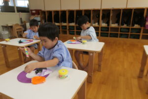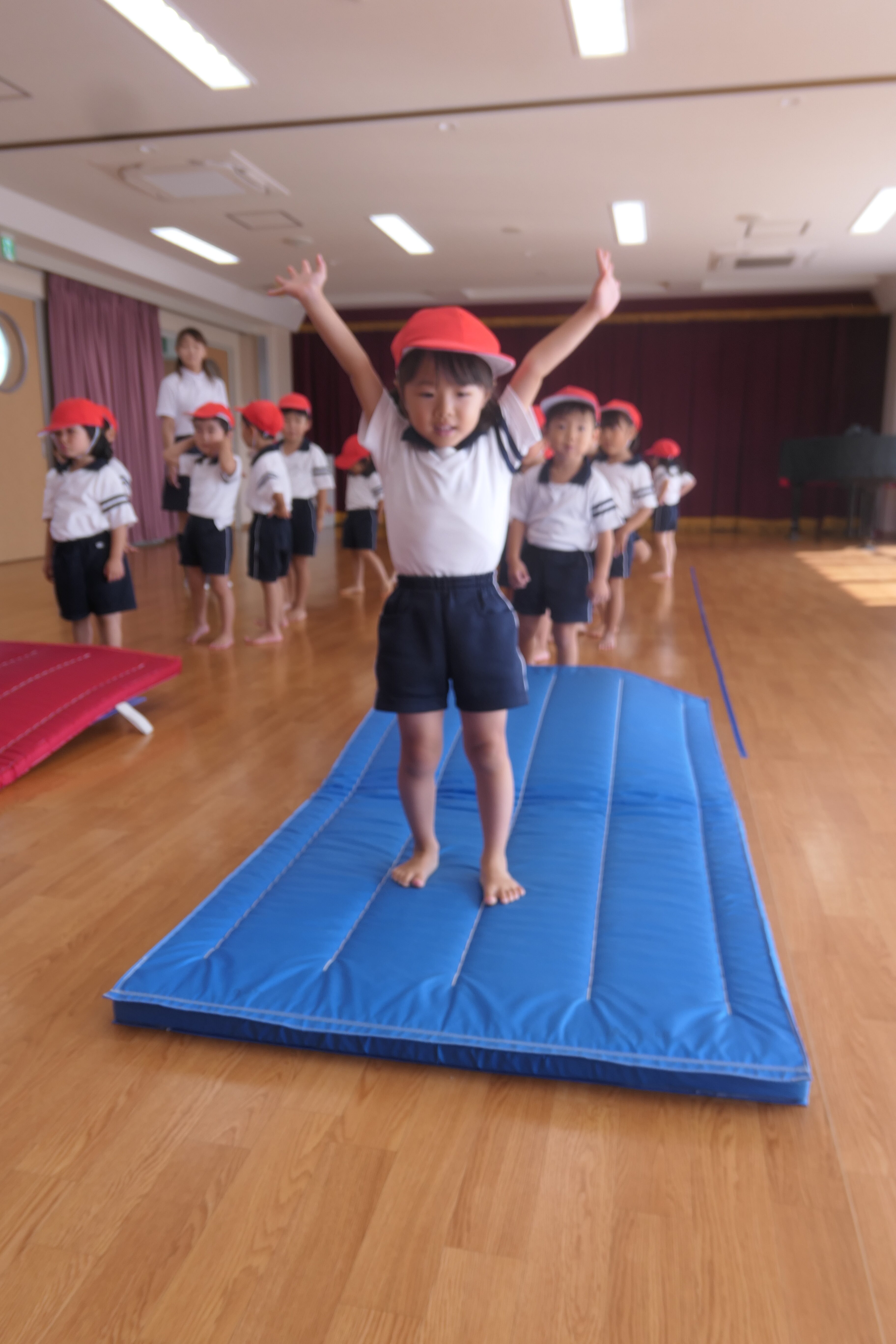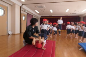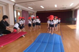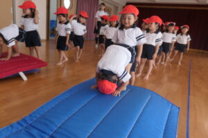 運動活動で前転、後転をしました。前転は一人で行うことが出来るようになり最後のポーズまで得意気にかっこよく決める子ども達。後転は耳の横ででうさぎの耳を作り回転しますが、マットに掌を着かず回転しようとしたり、着地の時に膝から着地しようとする様子が見られ、足の裏を着いて着地することを伝え、先生に援助されながら行いました。先生に援助してもらったり、声掛けされることで少しずつ意識して取り組もうとする姿が見られました。