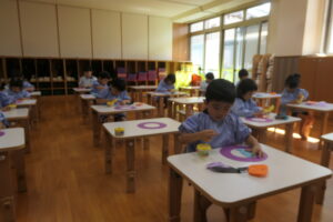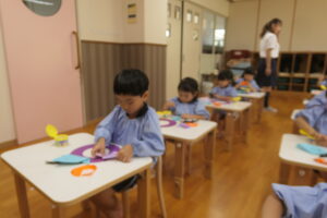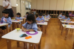 ハロウィンリースを作りました。折り紙を折った時からリースを作る事を楽しみにしていた子ども達。「どこにつけようかな~」「お家に飾ろうかな」「玄関に飾る」などワクワクした表情を浮かべながら台紙に折った折り紙を糊付けしていました。カラーシールでデコレーションして完成すると「可愛い」「お父さんお母さん喜んでくれるかな」と持ち帰って飾ることを楽しみにしている子ども達です。