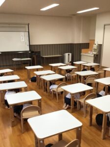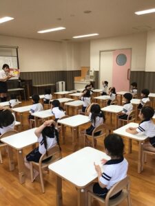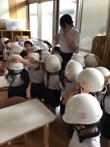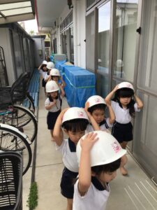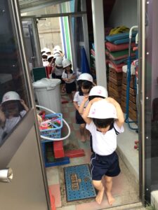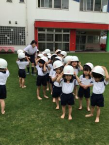 『じしんのときのおやくそく』の紙芝居を見ました。『ダンゴムシのポーズ』が出てくると、手を頭に乗せていました。実際机の下に避難をすると、頭や足が出ているお友達が…。もう一度小さくなる練習をすると、上手にダンゴムシに変身できました。園庭に避難する際は、少し不安そうにする姿も見られましたが、『お(押さない)』『は(走らない)』『し(しゃべらない)』『も(戻らない)』の約束を守って避難することが出来ました。先生の話をしっかり聞いて避難することも約束しました。ご家庭でも『お・は・し・も』の約束を聞いてみてください。