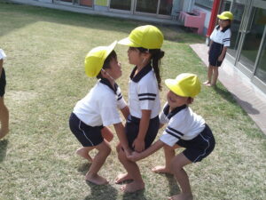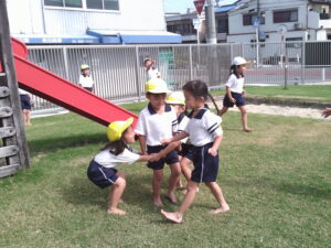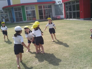 鬼にタッチをされると凍り、仲間の友達2人に電子レンジに入れて貰うと溶けて動けるようになる”電子レンジ”鬼ごっこをしました。はじめは、凍っているお友達を見つけても、なかなか仲間の友達が来てくれなくて”解凍”できない姿が見られました。凍っているお友達を見つけた時には、友達を大きな声で呼んで一緒に凍っている友達を解凍する事を確認しました。近くにいる仲間の友達を呼びかけて向かい合って手をつなぎ、凍っている友達の頭から足までを「チーン」と言いながらくぐらせて解凍してあげる姿が増えました。また、凍った友達は「たすけてー」と自ら仲間に呼びかけて解凍してもらおうとする姿が見られました。鬼を交代したり人数を増やしたりして楽しみました。
