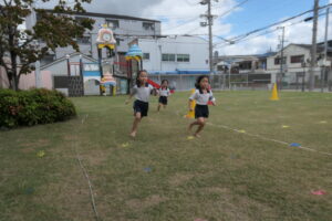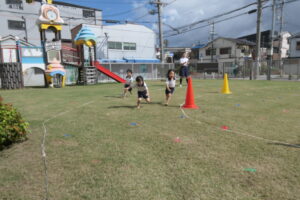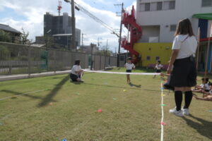 運動会リハーサルをし、かけっこやパラバルーン、他クラスの競技を応援しました。   初めて見る他クラスの競技に「どんなことするのかな」「楽しみ」「スタートするところがぱんだぐみと反対なんだね」など子ども同士で話し、ワクワクした表情を浮かべていました。競技が始まると拍手をして一生懸命応援していました。           ぱんだぐみの順番になると「頑張る」「1番になる」と意気込み最後まで一生懸命頑張っていました。かけっこでは走っている途中におしゃべりをしたり、力を抜いて走る姿が見られました。きりんぐみやらいおんぐみのお友達が全力で走る姿を見て「早いね」「かっこいい」と話し、刺激を受けた様でした。最後まで全力で走ることができるようにがんばります。