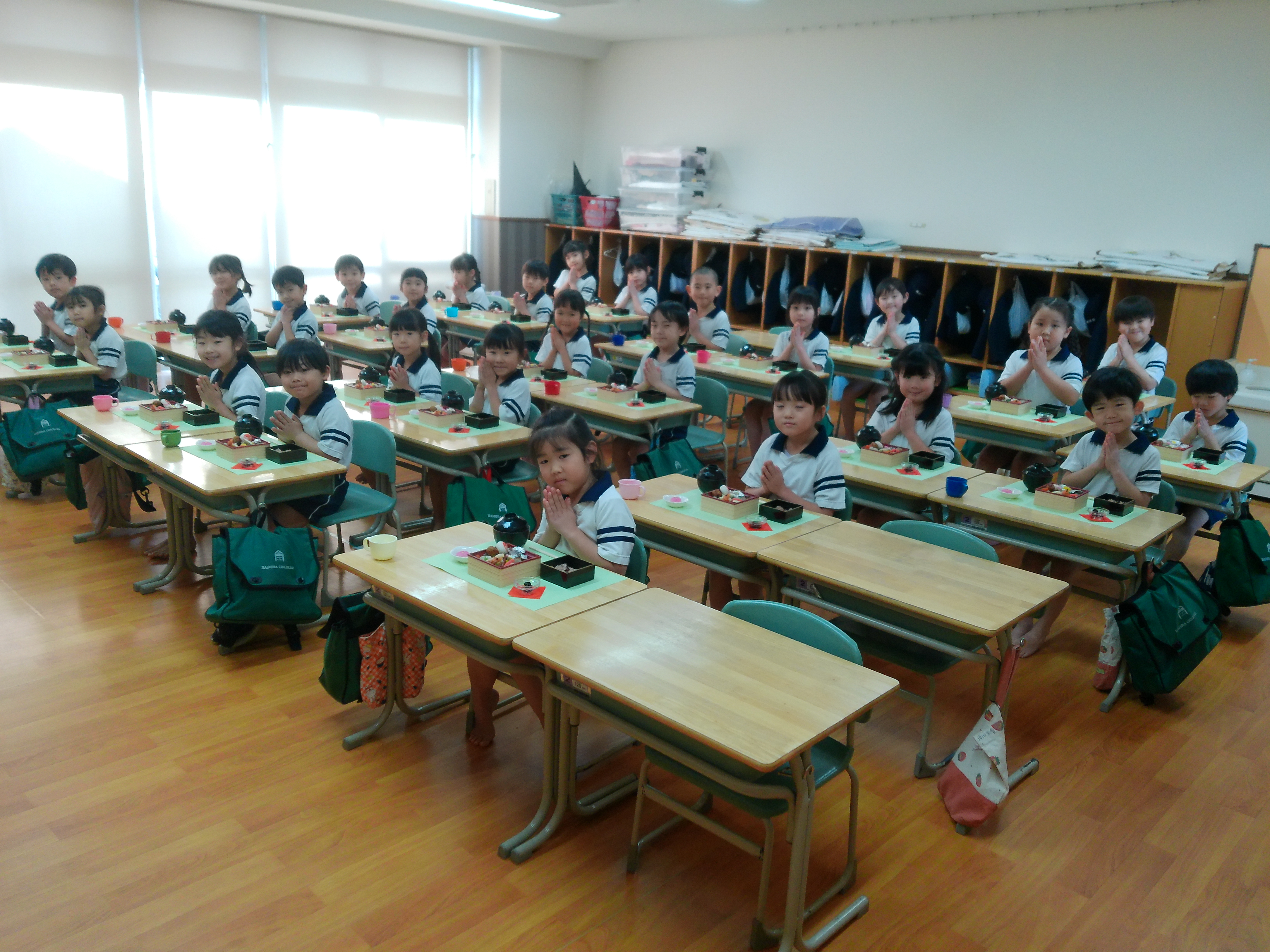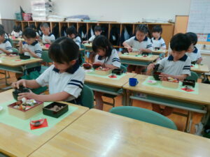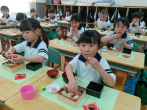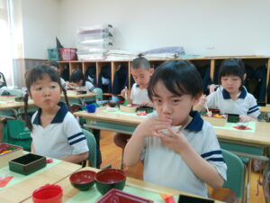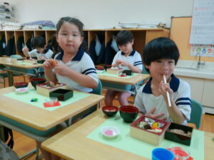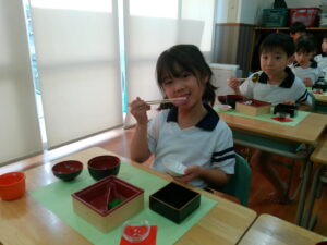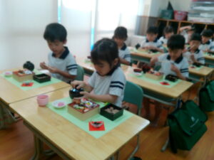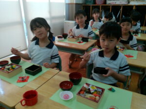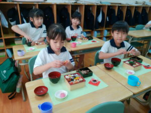 おせち料理を頂きました。配膳されたお重を見て、梅や葉っぱの形に飾り切りされた野菜や、綺麗に盛り付けされた色とりどりのお料理に目を輝かせていました。そして、おせち料理には、「海老のように腰が曲がるまで長生き出来るように」「まめに働くように」「よろこぶ」など、ひとつひとつ意味が込められているという話をすると、お重の中をじっくりと見ながら聞く姿が見られました。汁椀の蓋を開けることに苦戦するお友達もいましたが、側面を軽く押すと開けられることを教わり、再度挑戦して蓋を開けることが出来ていました。お赤飯を一口食べると、もち米が使われていることに気付いたり、くわいを見て「これはなんだろう?」と不思議そうにしたり、「馬の絵が描いてあるお料理はどんな味がするんだろう?」と興味をもったりしながら、食べ馴れない食材も進んで口にしていました。デザートの和菓子は梅の形に喜び、「あんこが入ってる!」「甘くて美味しい!」と言い、嬉しそうに完食する子ども達でした。