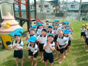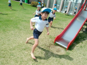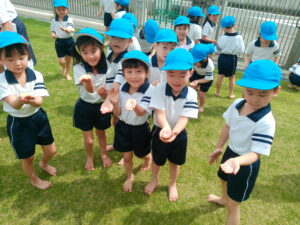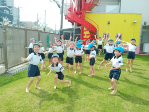 青い帽子をかぶり、園庭に出ると大はしゃぎの子ども達。桜の花びらを集めたり、「5.4.3.2.1.0」とカウントダウンして、花びらを舞い上がらせたり、園庭の隅に咲いている黄色い花を見つけたりして楽しみました。先生対みんなで、鬼ごっこをしたり、増え鬼ごっこをしたりして、春の陽気や芝生の感触を味わい、園庭中を走り回って遊びました。