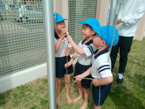 こいのぼりの歌を歌い、こいのぼりを揚げました。大きなこいのぼりが風になびいて泳ぐと、「泳いでる」「凄い大きい」と、歓声を上げて喜んでいました。