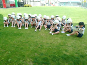 らいおんぐみの保育室からの避難の仕方、ヘルメットの受け取り方などを確認し、避難経路を歩きました。避難するときの「お.は.し.も」も確認し、命を守ることの大切さをみんなで話をしました。