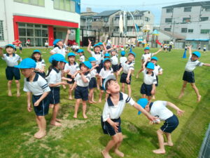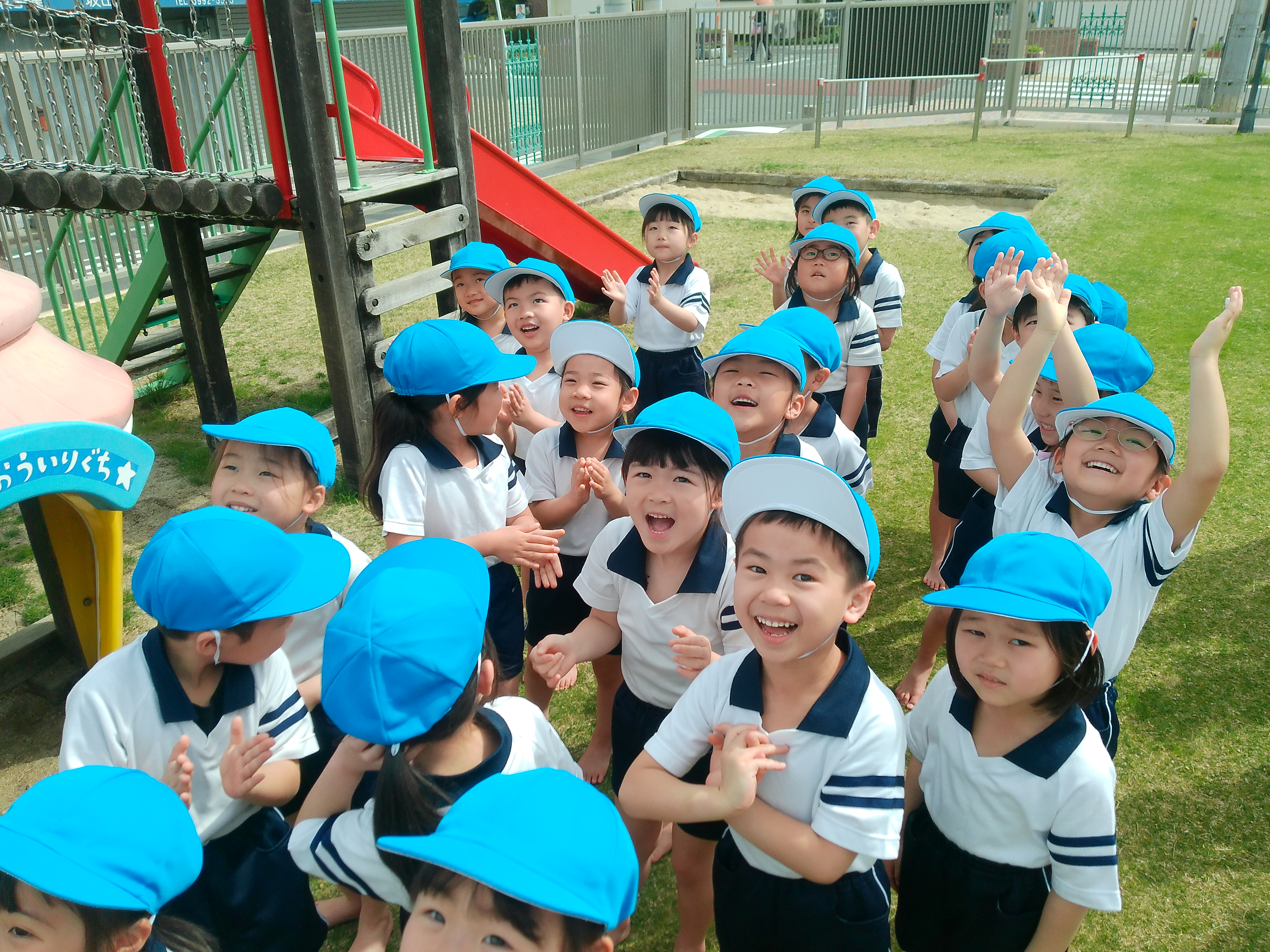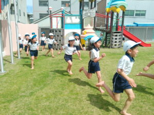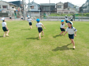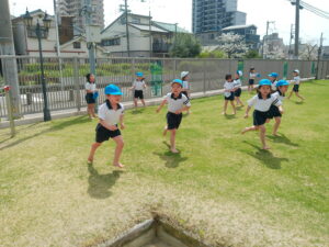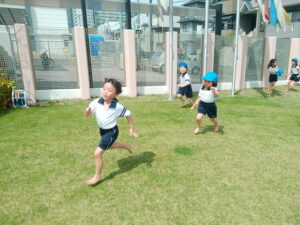 青い帽子をかぶり、園庭に出ると大はしゃぎの子ども達。桜の花びらを集めたり、「5.4.3.2.1.0」とカウントダウンして、花びらを舞い上がらせたり、園庭の隅に咲いている黄色い花を見つけたりして楽しみました。先生対みんなで、鬼ごっこをしたり、増え鬼ごっこをしたりして、春の陽気や芝生の感触を味わい、園庭中を走り回って遊びました。