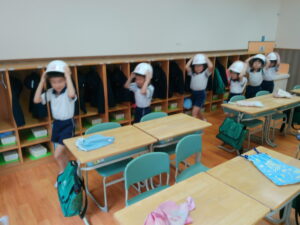 らいおんぐみの保育室からの避難の仕方、ヘルメットの受け取り方などを確認し、避難経路を歩きました。避難するときの「お.は.し.も」も確認し、命を守ることの大切さをみんなで話をしました。