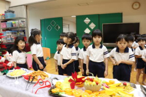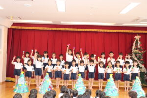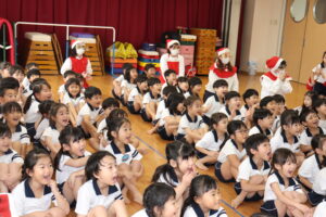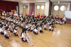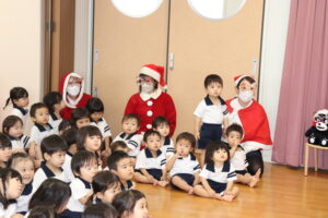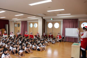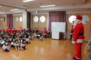 『動物たちのクリスマス』のパネルシアターを見ました。クリスマスツリーが大きくなる度に歓声が上がっていました。先生のマジックショーでは、プレゼントが増えたり、白黒のツリーに色がついたりし、目を丸くして驚いていました。らいおんぐみのお友達のハンドベルの演奏はみんな静かに聞き入っていました。そして鈴の音がしてサンタクロースが登場すると、大喜びの子ども達。プレゼントがあることを聞き、さらに喜んでいました。