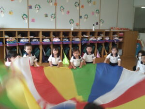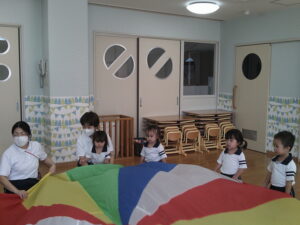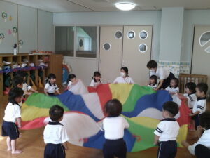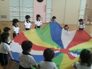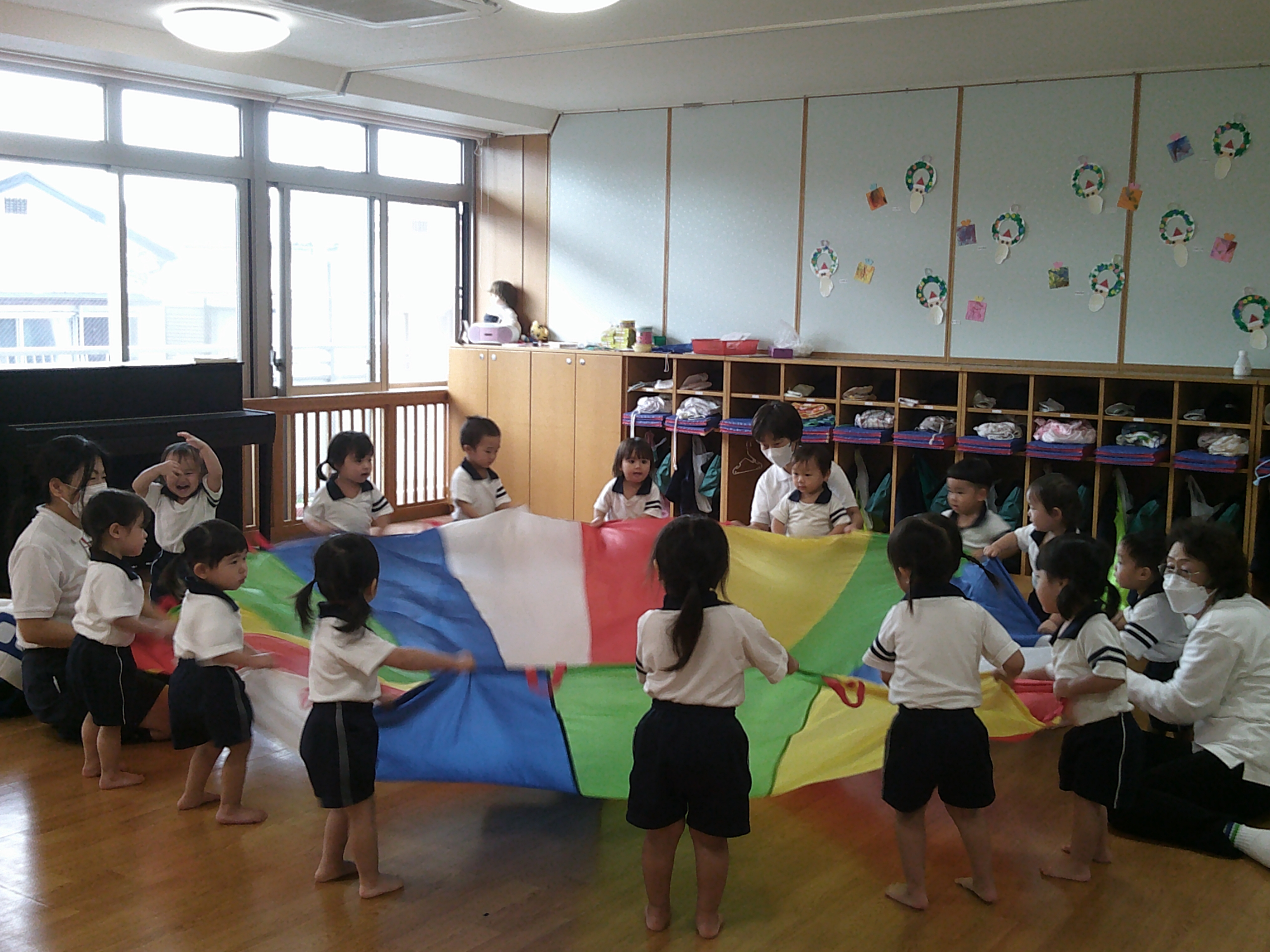 パラバルーン(1歳児クラス) 2025.12.01 パラバルーンを持って嬉しそうに上下にパタパタと動かす子ども達。先生の合図に合わせて大きく上下に動かしたり、左右に揺らしたりと笑顔いっぱいでした。ボールを乗せると大喜びでボールを弾ませようと一生懸命パラバルーンを動かしていました。