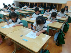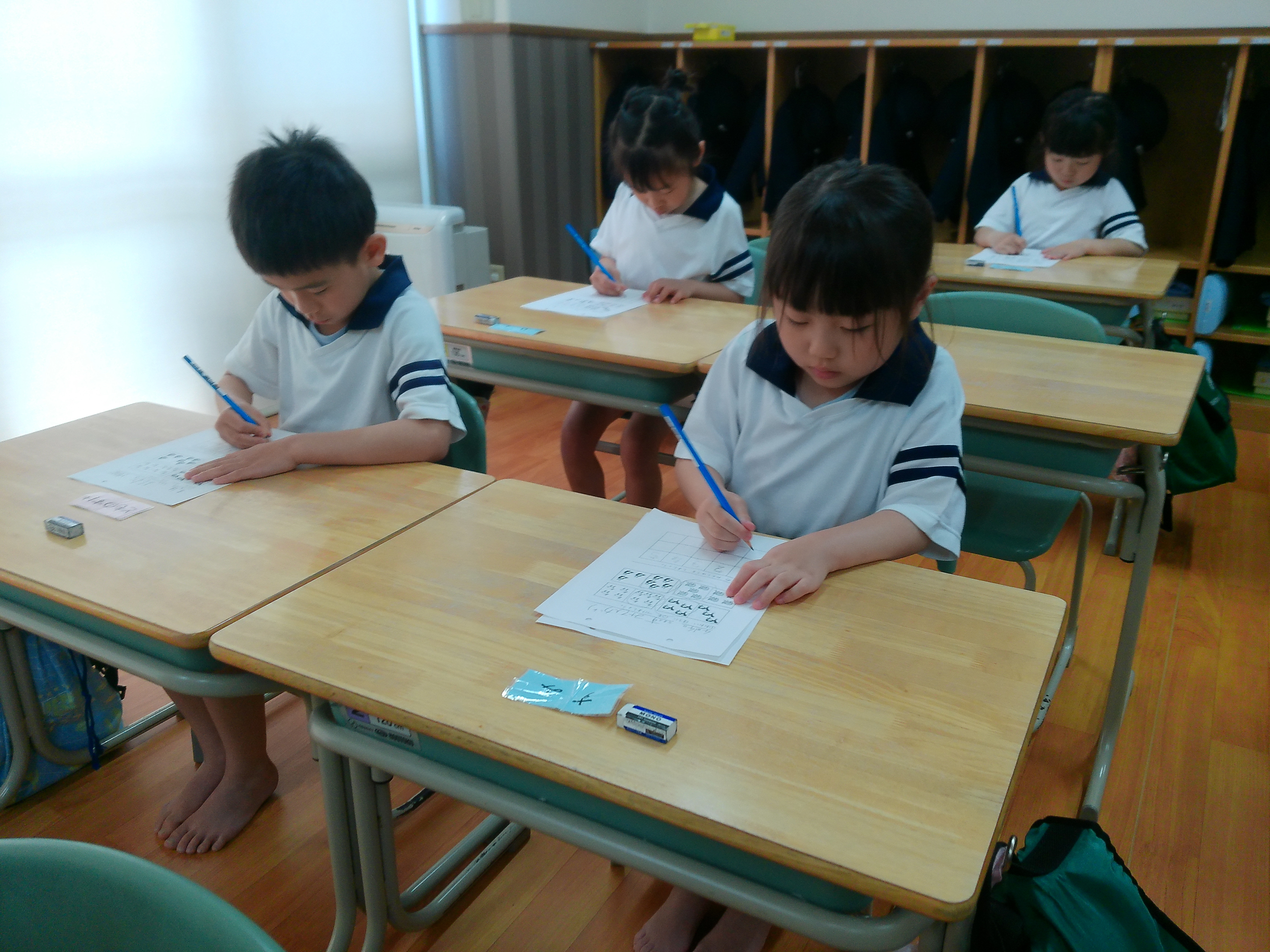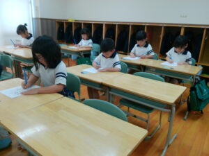 らいおんぐみになり、初めてプリント活動をしました。鉛筆の持ち方、手の置く位置、姿勢などを意識することを約束しました。鉛筆が正しく持てないお友達が多くいました。鉛筆は、人差し指と親指で摘まんで中指を枕にすること、手の置く位置は鉛筆を持っている手より、座っている方に置くことを伝えました。姓名の間は一文字分空けること、文字は丁寧に書くことなども約束をしました。子ども達は一生懸命にプリントを取り組んでいますので、プリントを持ち帰った際は、ご家庭でも、正しい鉛筆の持ち方や、丁寧に文字を書くことを教えてあげて下さい。