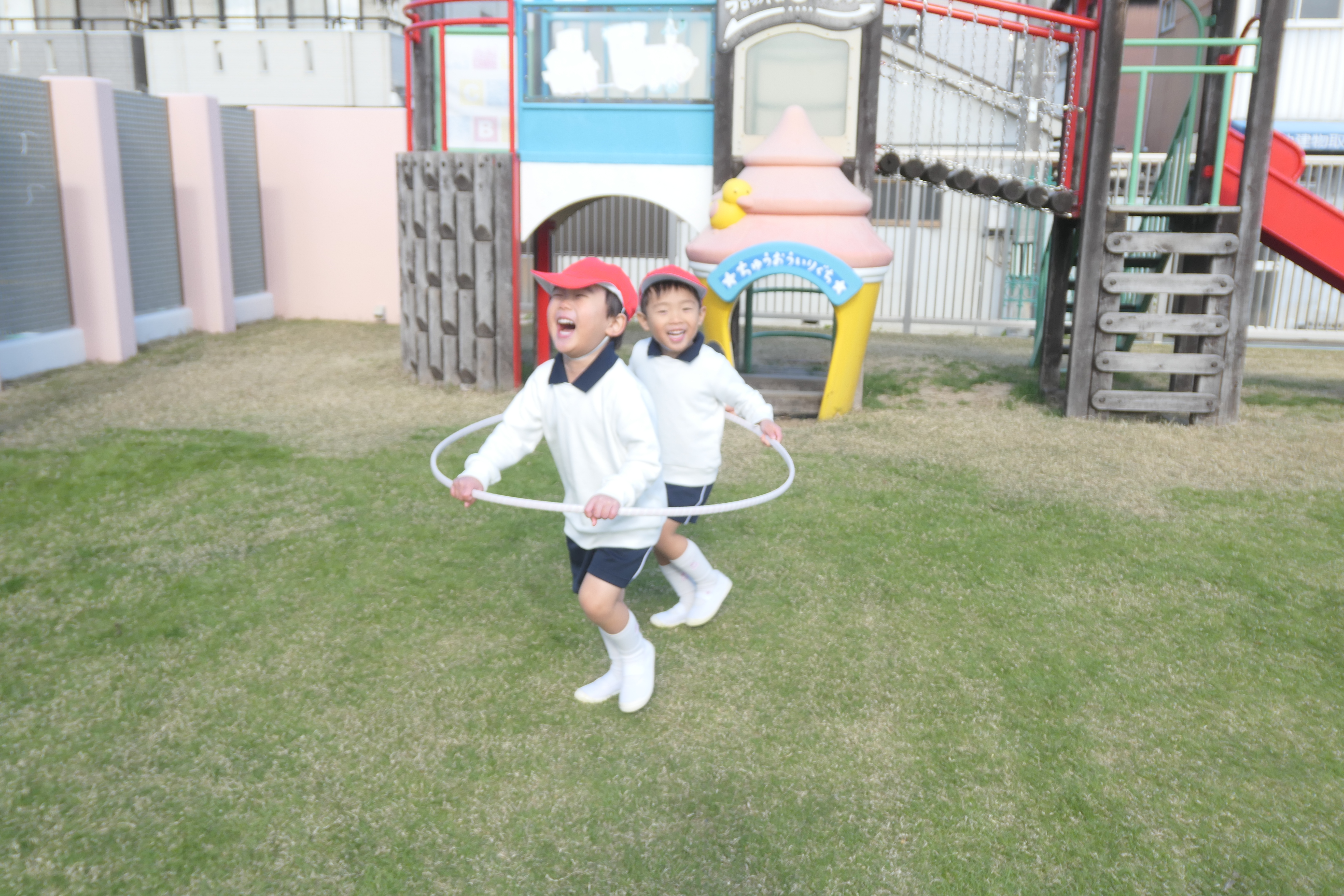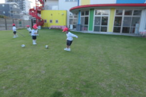 園庭に出ると身体を縮こめ「寒い~!!」と話していましたが、身体を動かすうちに「寒くなくなった」「動いてたら暑くなってきちゃった」と笑顔を浮かべていました。 友達と電車ごっこや、ピクニック、ボールやフープを転がしたり投げたりする距離を競ったりして笑顔いっぱい仲よく遊びました。「先生も一緒に入って~」「一緒に遊ぼう」とみんなで遊ぶことに喜び、沢山身体を動かして遊ぶ子ども達でした。