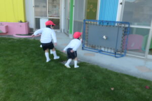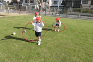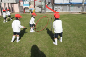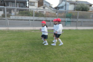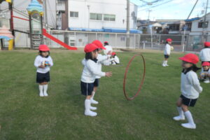 園庭に出ると身体を縮こめ「寒い~!!」と話していましたが、身体を動かすうちに「寒くなくなった」「動いてたら暑くなってきちゃった」と笑顔を浮かべていました。 友達と電車ごっこや、ピクニック、ボールやフープを転がしたり投げたりする距離を競ったりして笑顔いっぱい仲よく遊びました。「先生も一緒に入って~」「一緒に遊ぼう」とみんなで遊ぶことに喜び、沢山身体を動かして遊ぶ子ども達でした。