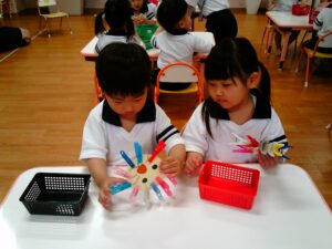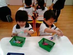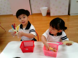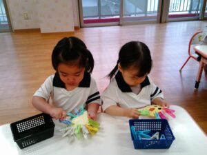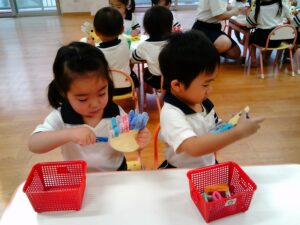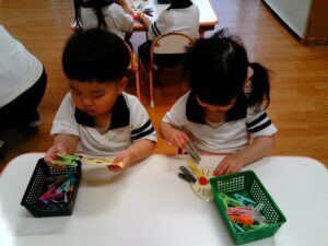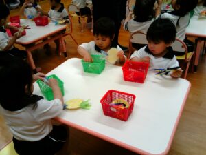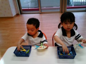 洗濯バサミをつけてライオンの顔を作りました。最初は「髪の毛ないね~」と話していた子ども達でしたが、洗濯バサミをたくさんつけていき、ライオンが完成すると「ライオン出来た!」「ガオ~!」と先生に知らせて楽しんでいました。