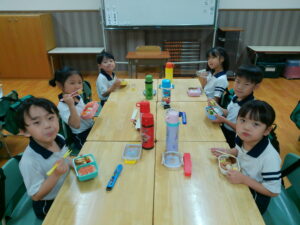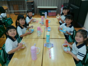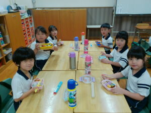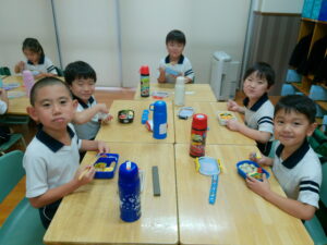 昼食には、お弁当を頂きました。お弁当の蓋を開けると「たまごやきが入ってる!」「おにぎり同じだね!」などと、どんなおかずが入っているのかを話す声が沢山聞こえてきました。嬉しそうに、味わってお弁当を頂く子ども達でした。